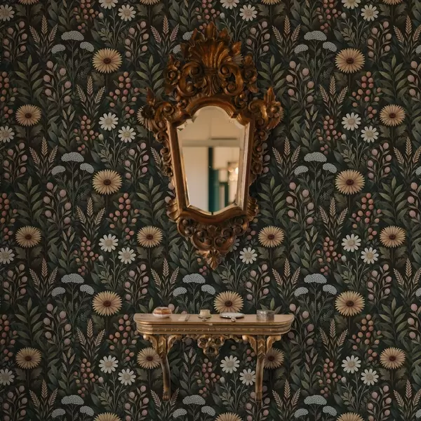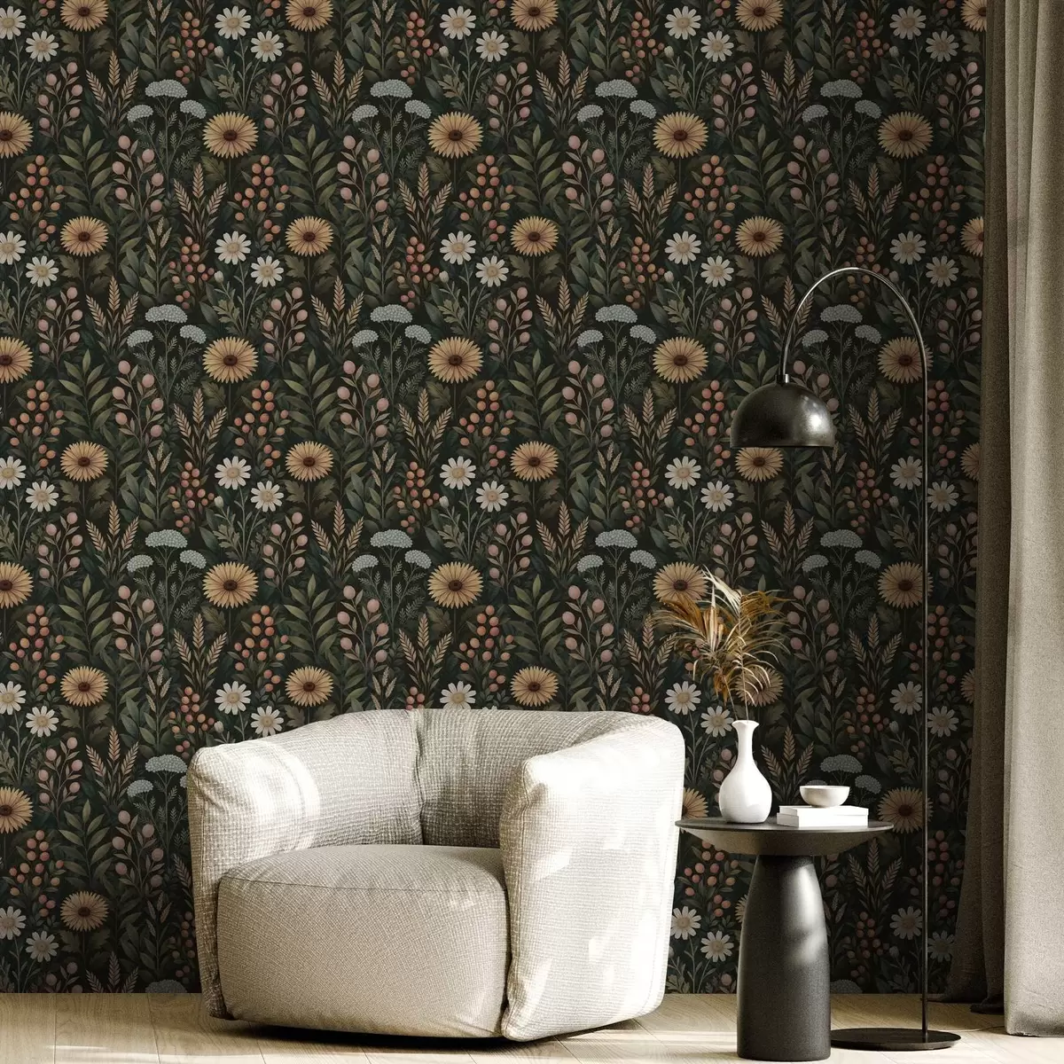 Papel pintado Flores silvestres y bayas sobre fondo oscuro, adorno natural Nr. a00707