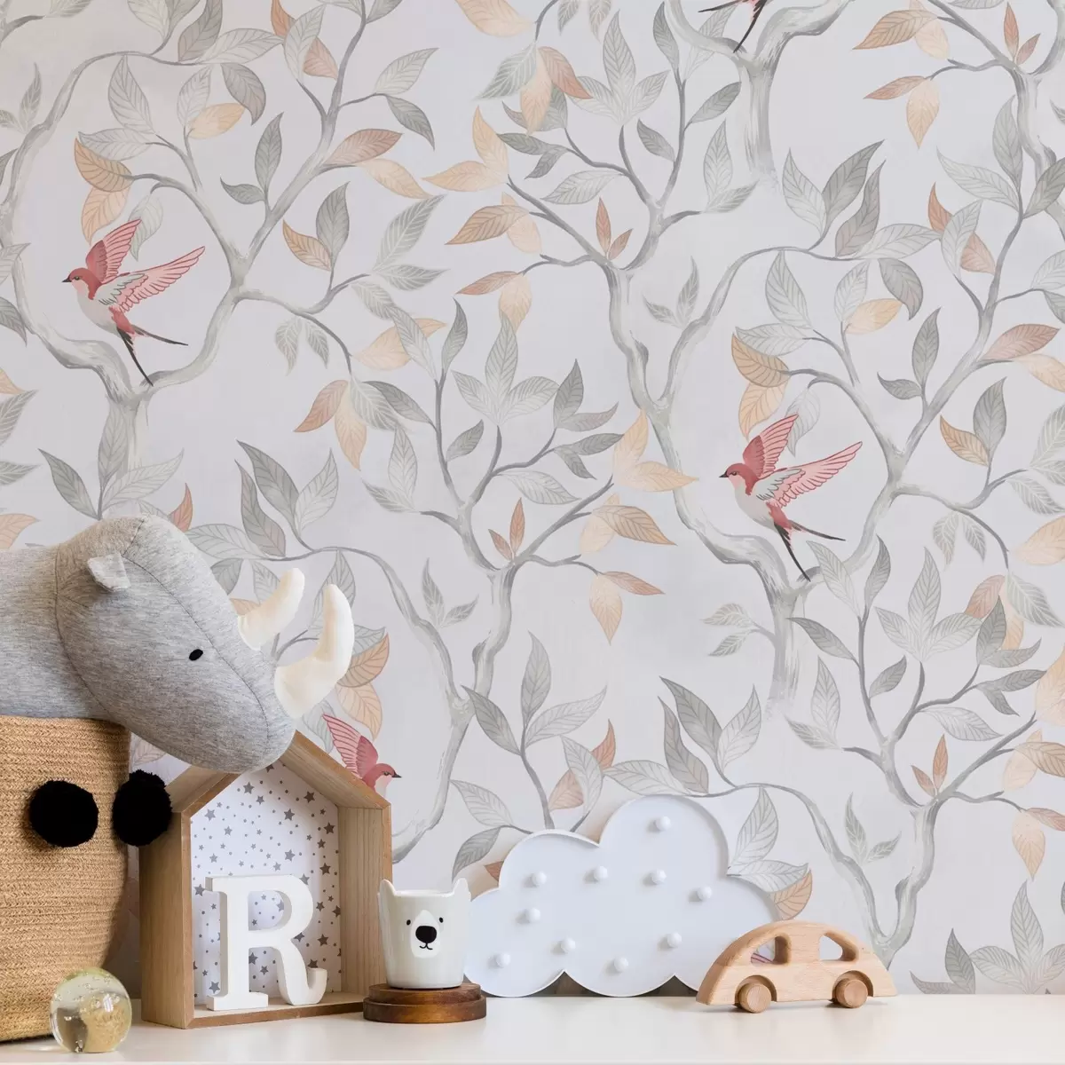 Papel pintado Ramas ligeras con hojas y pájaros en tonos melocotón Nr. a00716