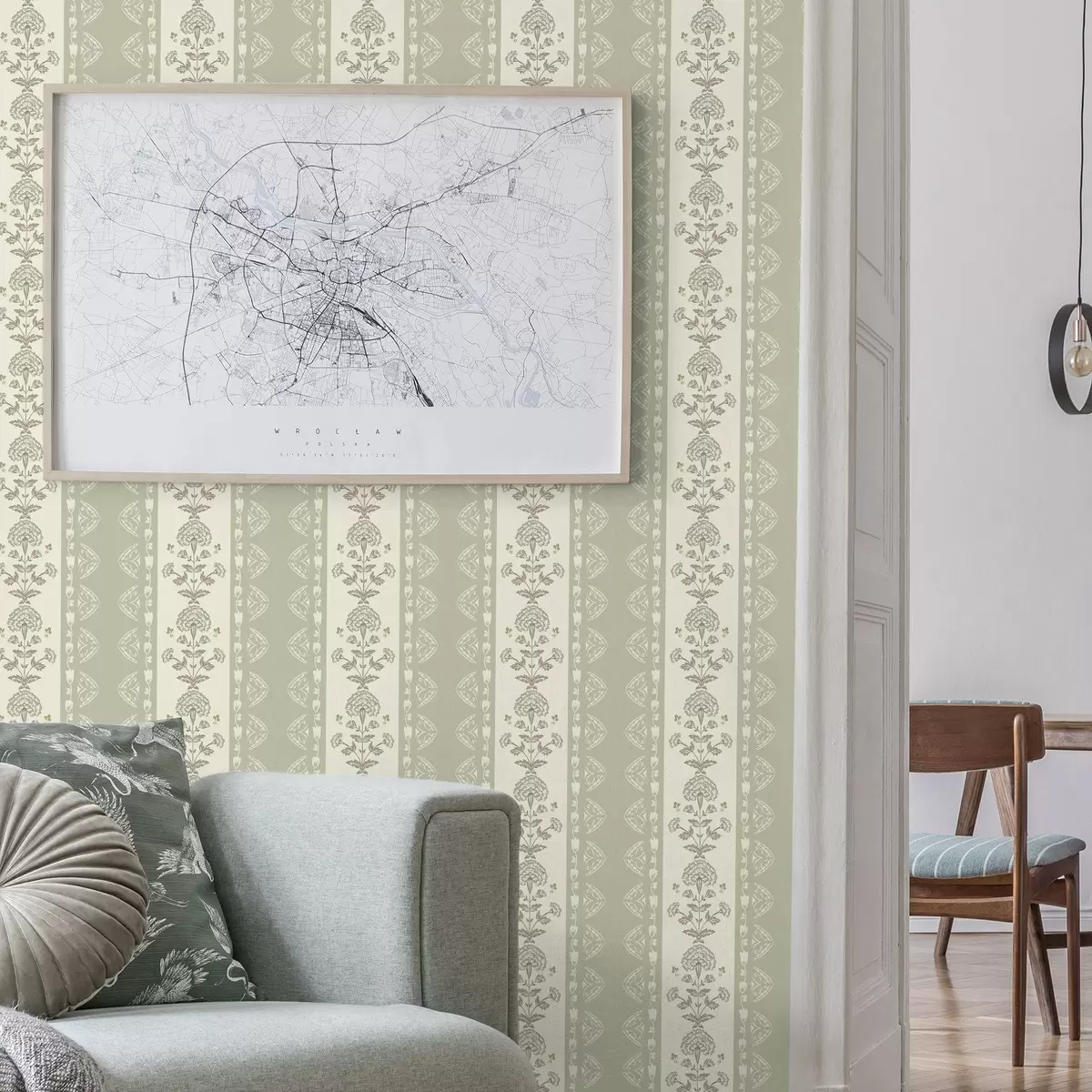 Papel pintado Adorno rayado con columnas florales en tonos salvia Nr. a00719