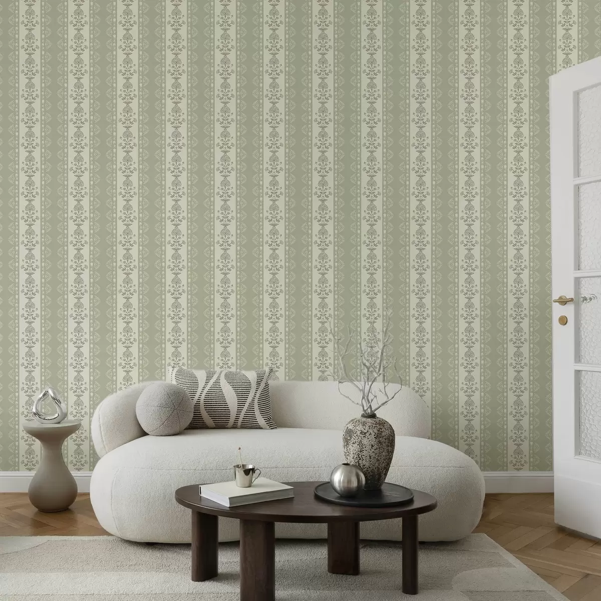 Papel pintado Adorno rayado con columnas florales en tonos salvia Nr. a00719