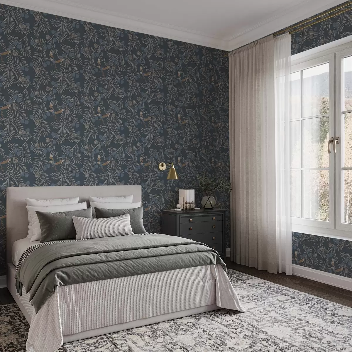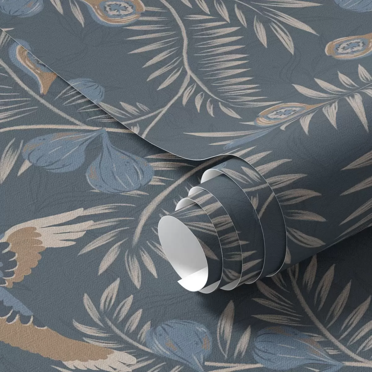 Papel pintado Pájaro entre frutos azules y hojas de palmera, índigo Nr. a00726