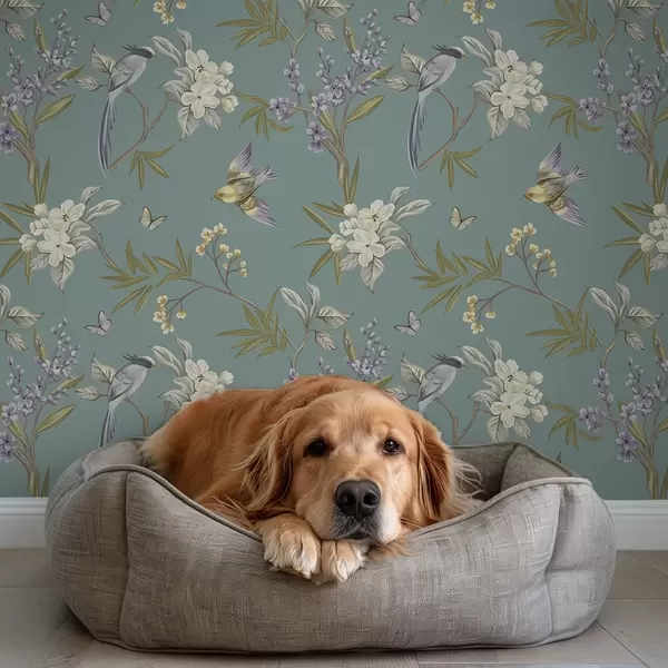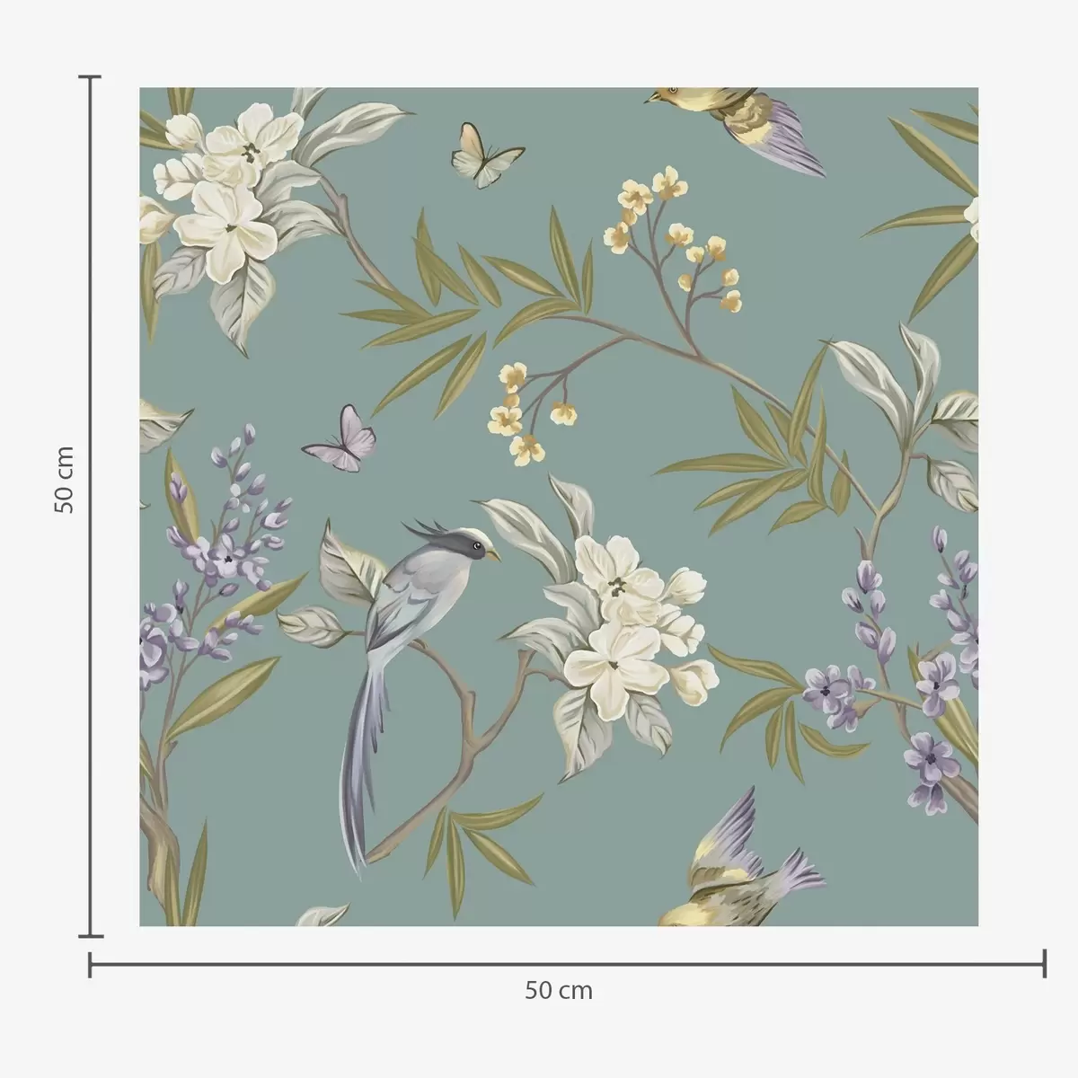Papel pintado Pájaros, flores y mariposas sobre un fondo azul grisáceo. Nr. a00735