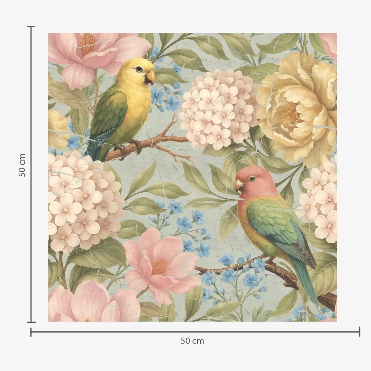 Papel pintado Loros entre peonías, hortensias y magnolias Nr. a00747