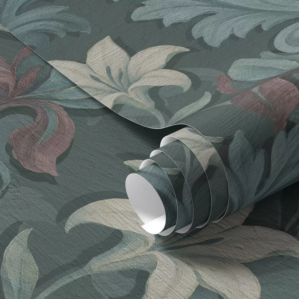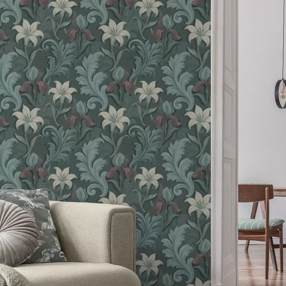 Papel pintado Fondo verde oscuro con iris y hojas decorativas Nr. a00755