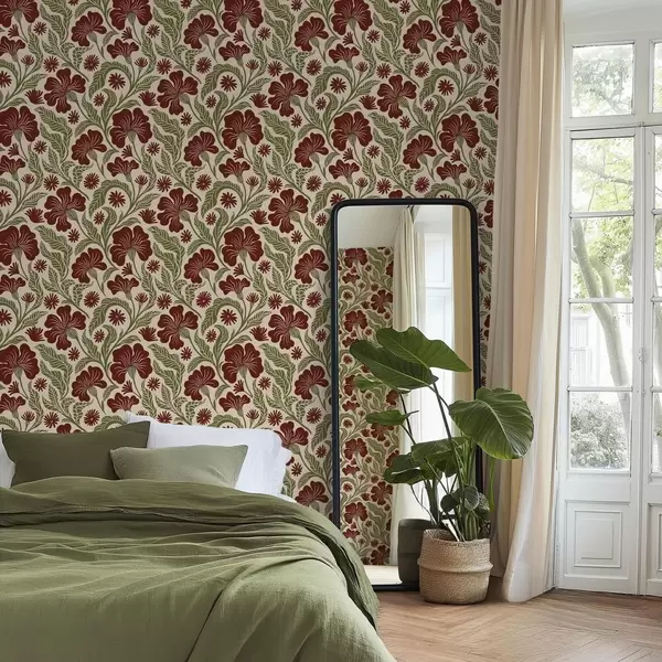 Papel pintado Flores de color burdeos con hojas verdes sobre fondo claro Nr. a00761