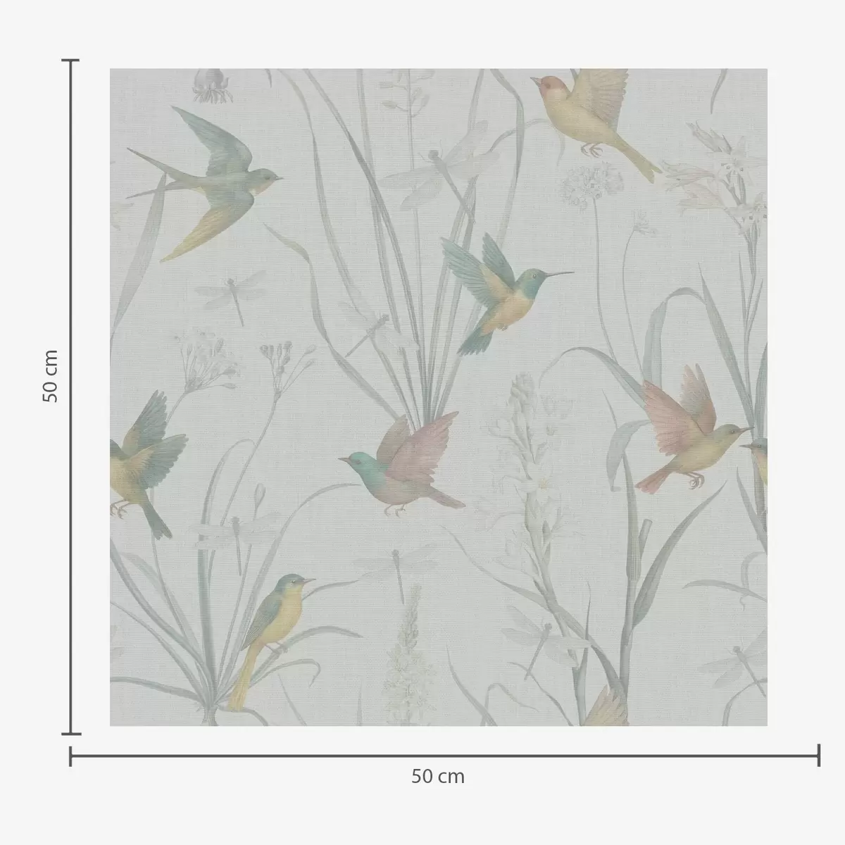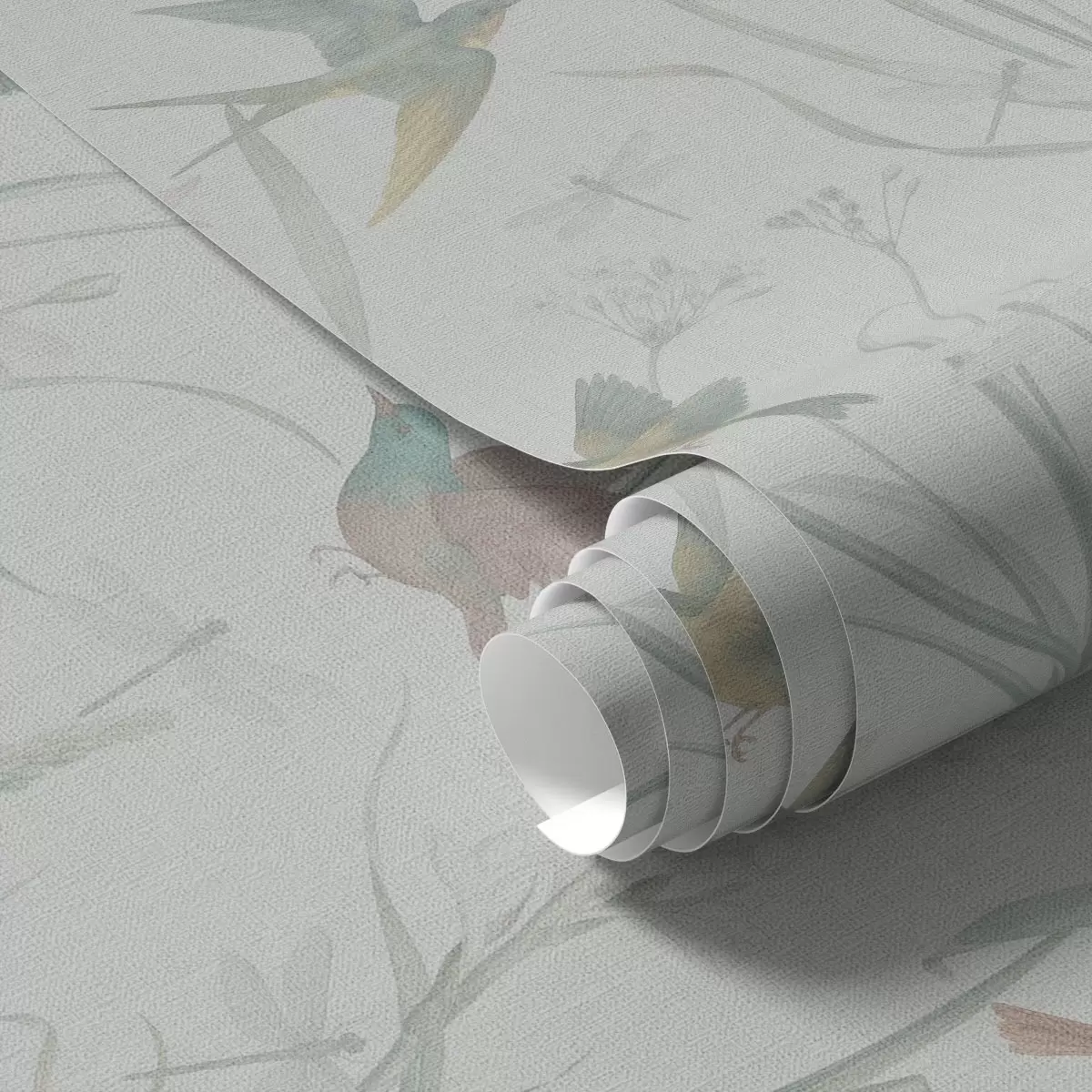 Papel pintado Pájaros entre la hierba del prado sobre un fondo gris claro. Nr. a00776v1