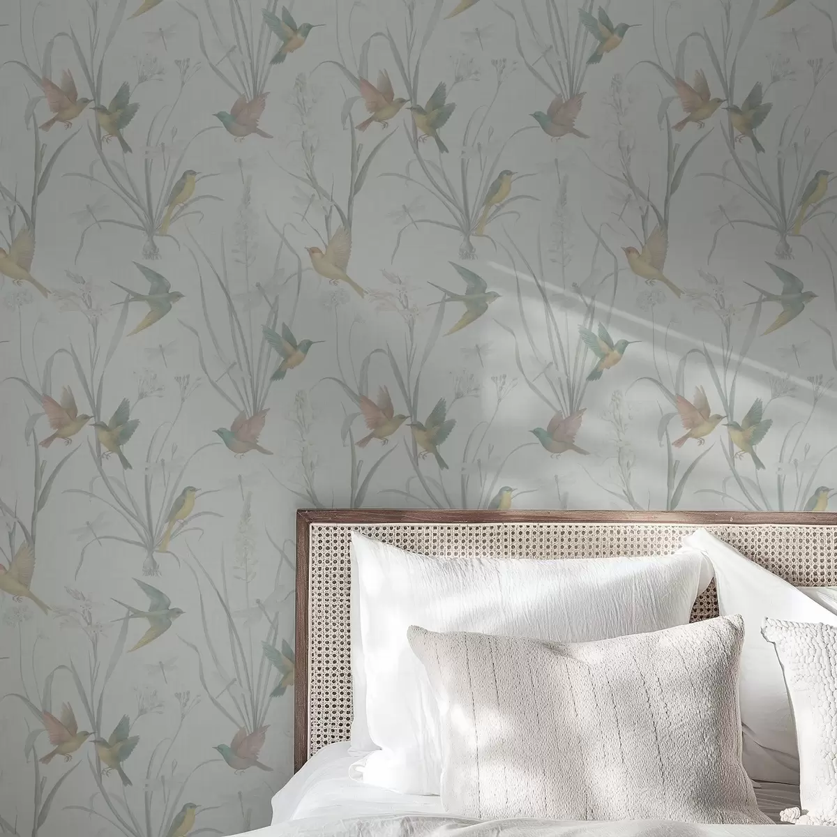 Papel pintado Pájaros entre la hierba del prado sobre un fondo gris claro. Nr. a00776v1
