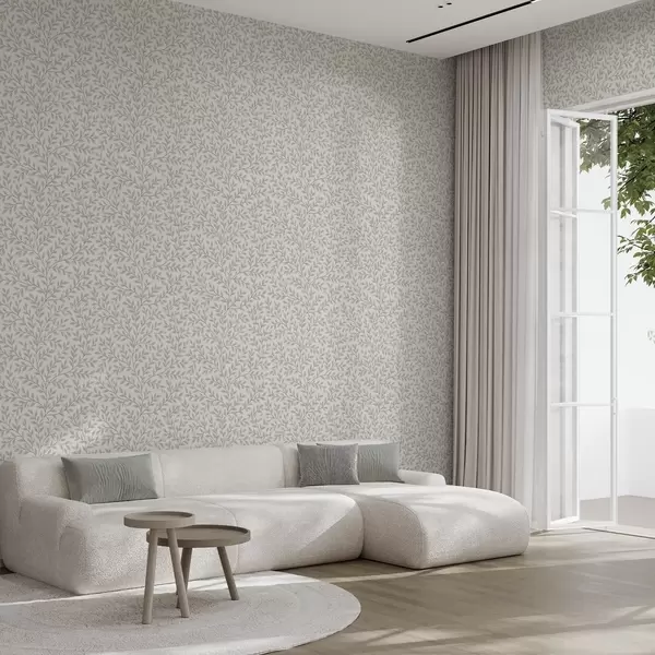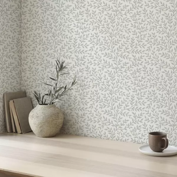 Papel pintado Ramitas con hojas y bayas, crema clara y salvia. Nr. a00783