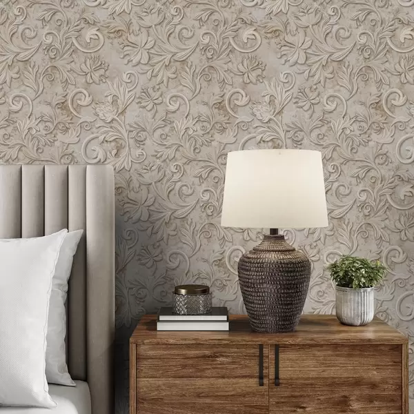 Papel pintado Relieve en piedra con volutas florales, beige vintage Nr. a00784