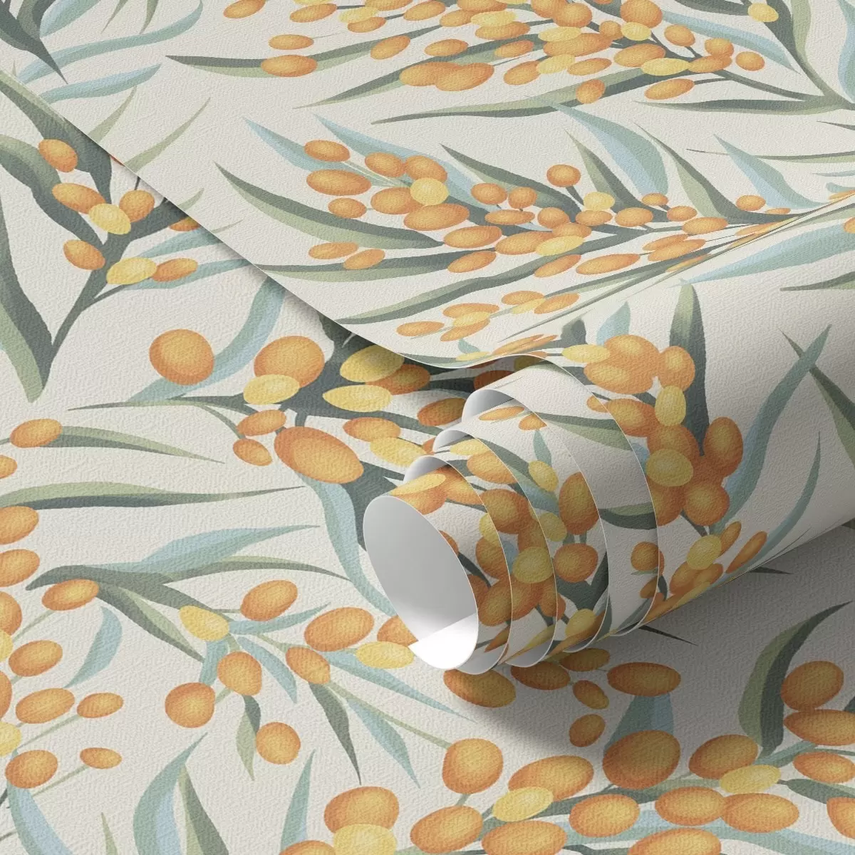 Papel pintado Ramas de espino amarillo con bayas naranjas, fondo claro Nr. a00792