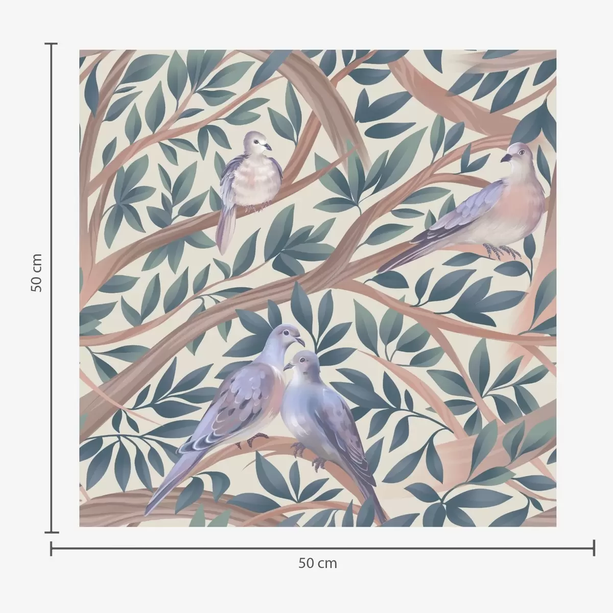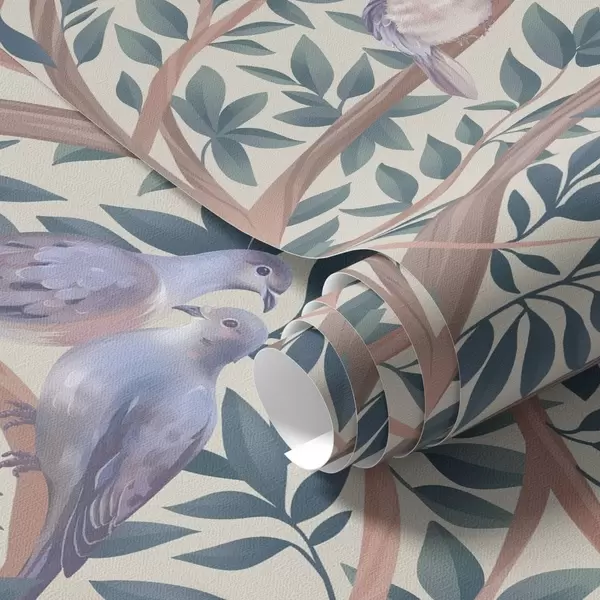 Papel pintado Palomas entre ramas y hojas en una suave paleta de colores pastel Nr. a00796