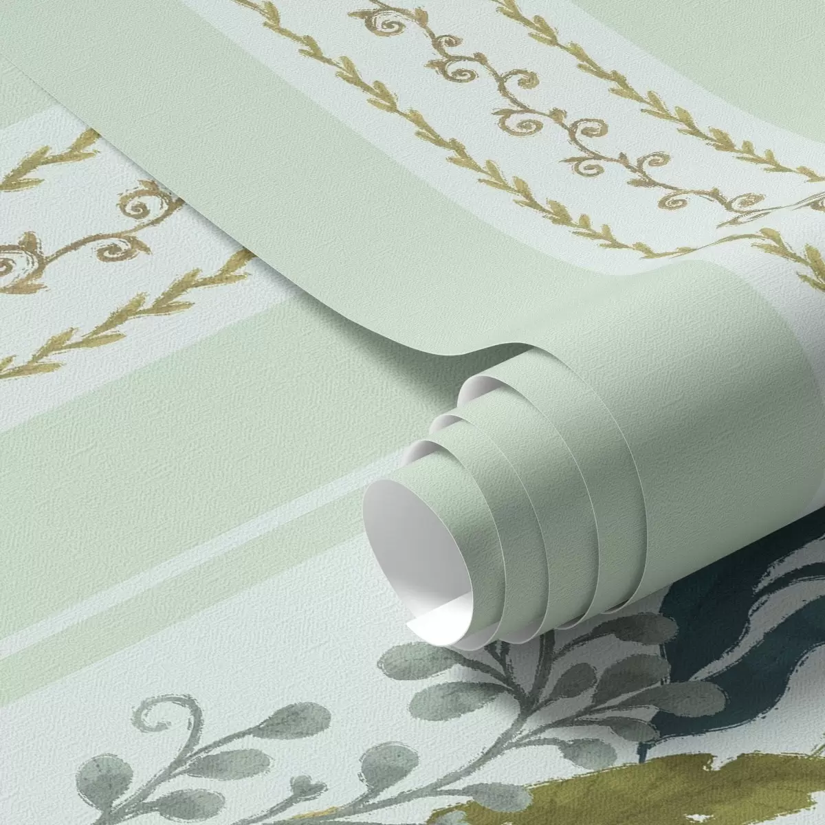 Papel pintado Rayas anchas con ramas pictóricas sobre un suave fondo menta. Nr. a00825v1