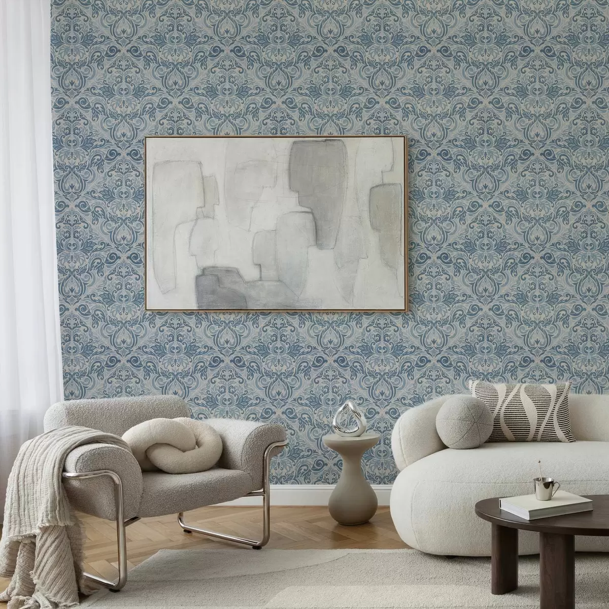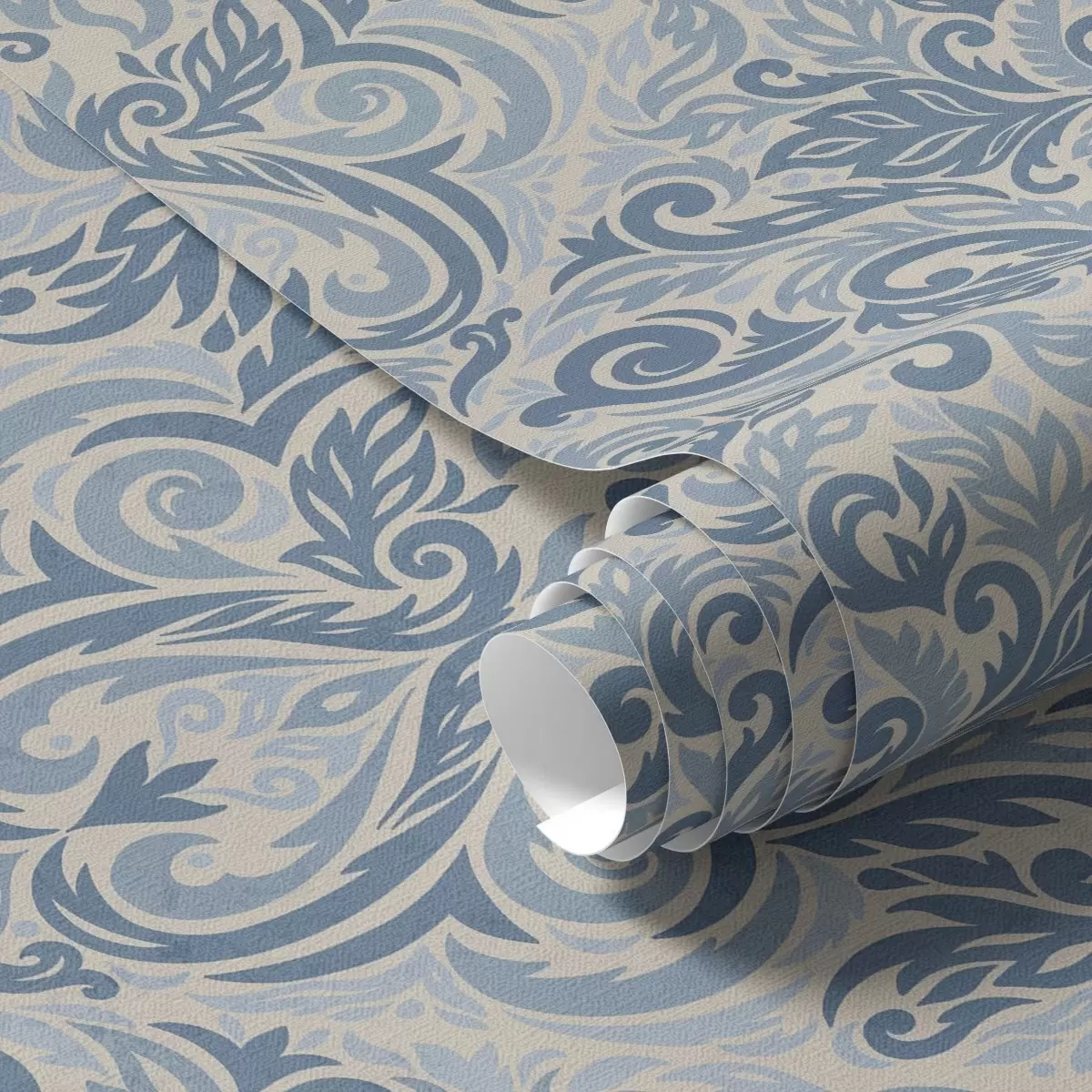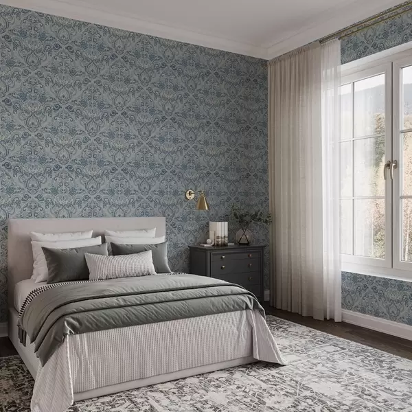 Papel pintado Damasco clásico, motivos azules sobre fondo crema. Nr. a00826v1