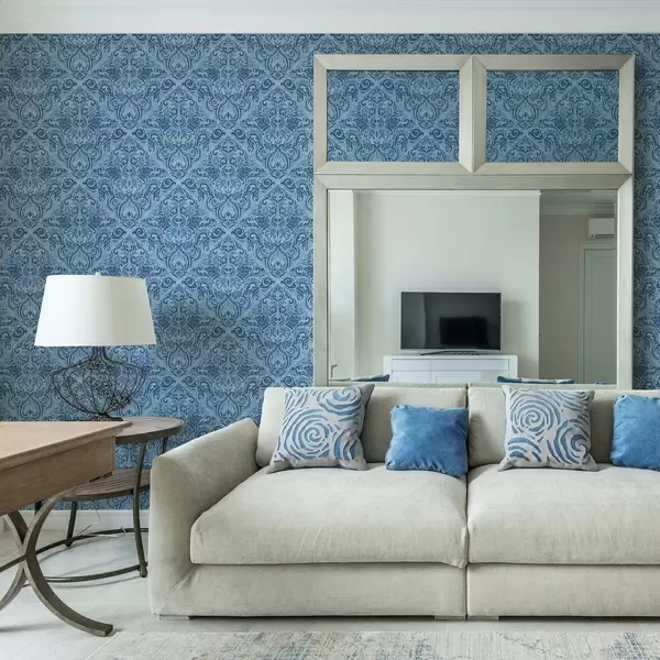 Papel pintado Damasco en tonos azules fríos, contraste más fuerte. Nr. a00826v2