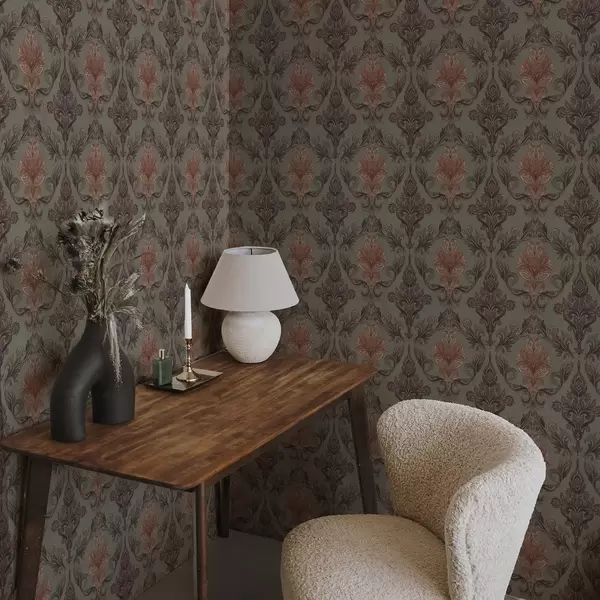 Papel pintado Damasco terracota sobre fondo oliva apagado Nr. a00828v3