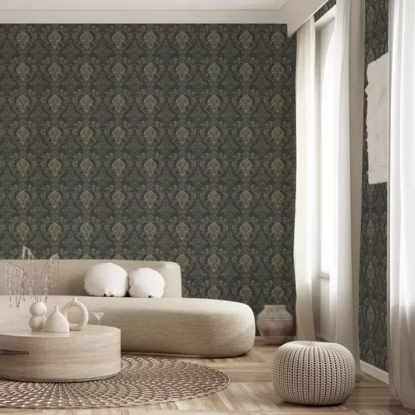 Papel pintado Damasco sobre fondo grafito oscuro, detalles en ocre oliva. Nr. a00828v5