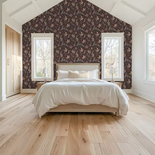 Papel pintado Flores color crema con hojas grises sobre fondo burdeos. Nr. a00833