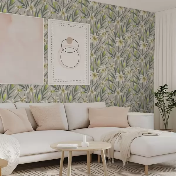 Papel pintado Lirios crema con hojas sobre fondo gris-beige Nr. a00837