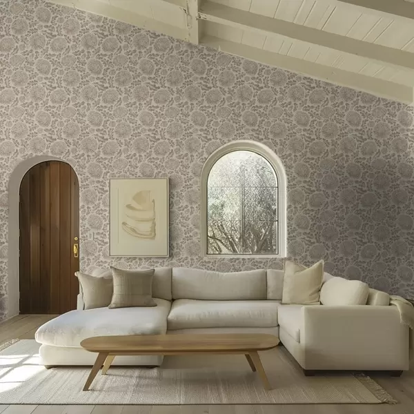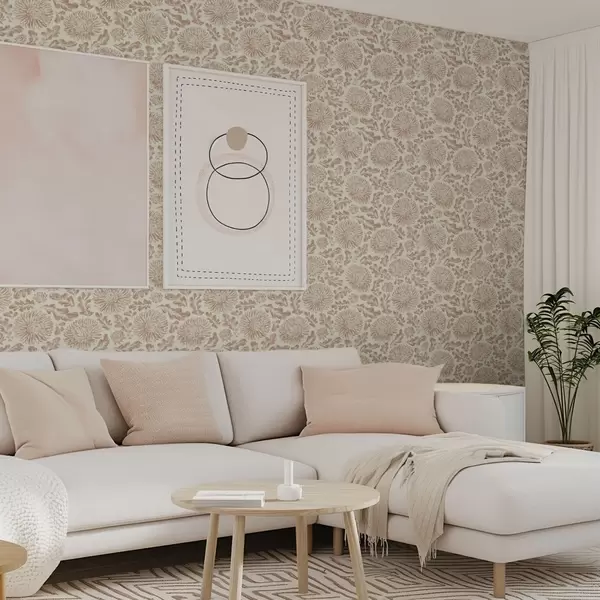 Papel pintado Crisantemos y hojas de roble en suave marrón beige. Nr. a00840