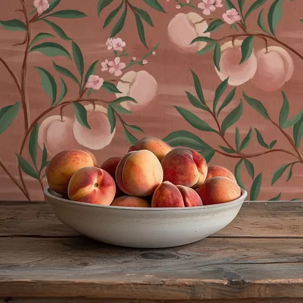 Papel pintado Melocotones en ramas con flores rosas, suelo de terracota Nr. a00856