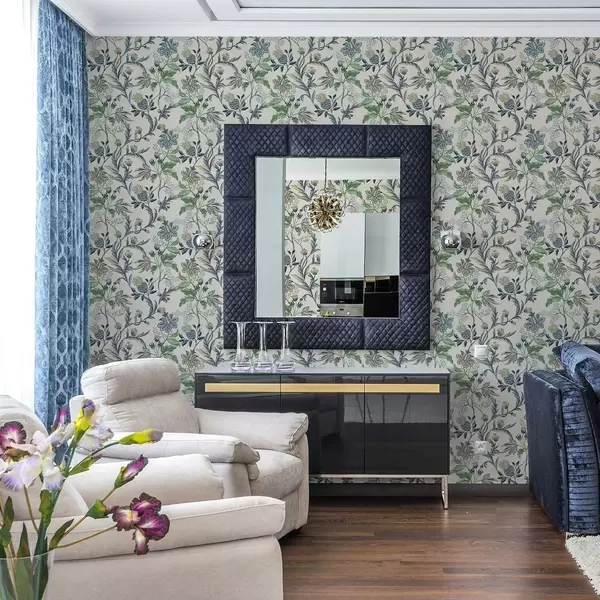 Papel pintado Flores y hojas folk azul verdosas sobre fondo crema Nr. a00863