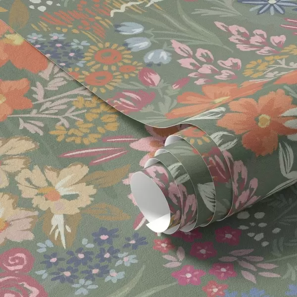 Papel pintado Flores campestres pintadas sobre fondo verde salvia Nr. a00864