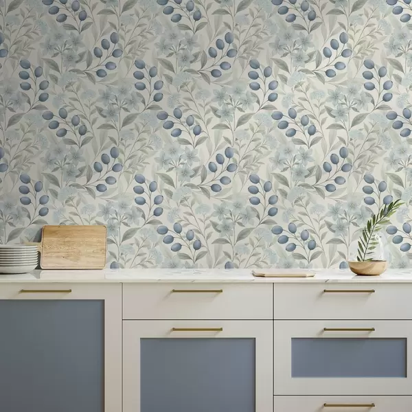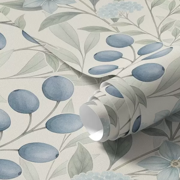 Papel pintado Arándanos azules y flores claras sobre marfil Nr. a00872