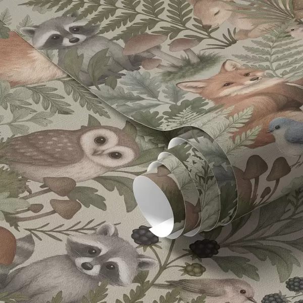 Papel pintado Animales del bosque, helechos y setas sobre fondo beige claro. Nr. a00880v1