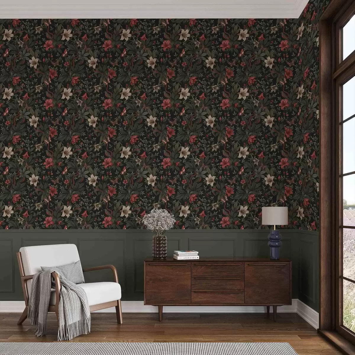 Papel pintado Flores oscuras de la selva con pájaros y mariposas Nr. a00895