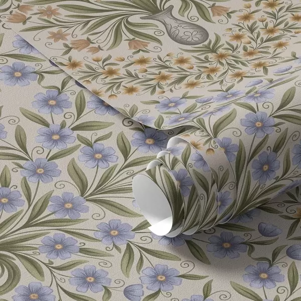 Papel pintado Jarrones populares con flores azules y hojas de olivo sobre fondo rosado. Nr. a00900
