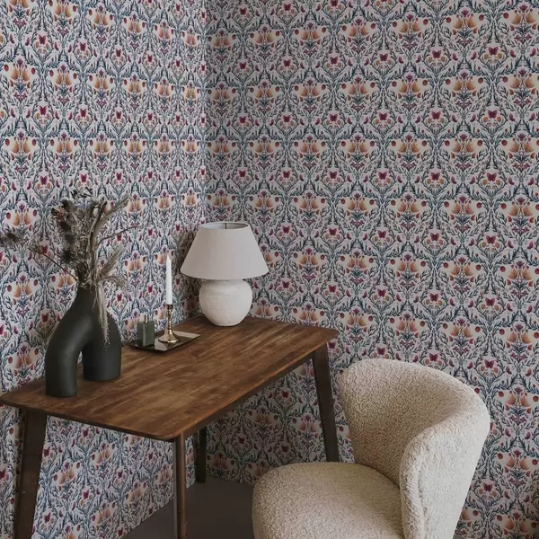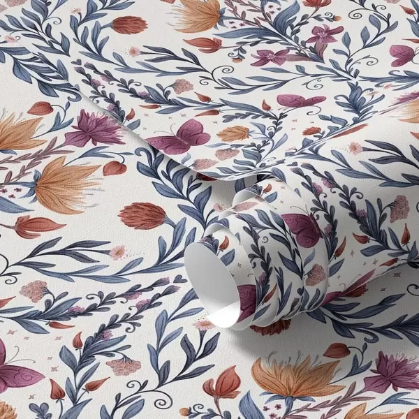 Papel pintado Damasco floral con mariposas sobre fondo crema cálido Nr. a00926v2