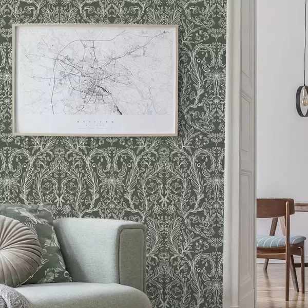 Papel pintado Diseño floral lineal sobre fondo verde oscuro. Nr. a00929