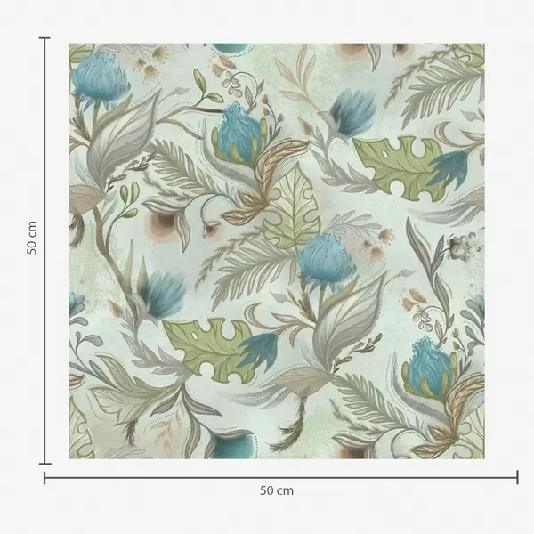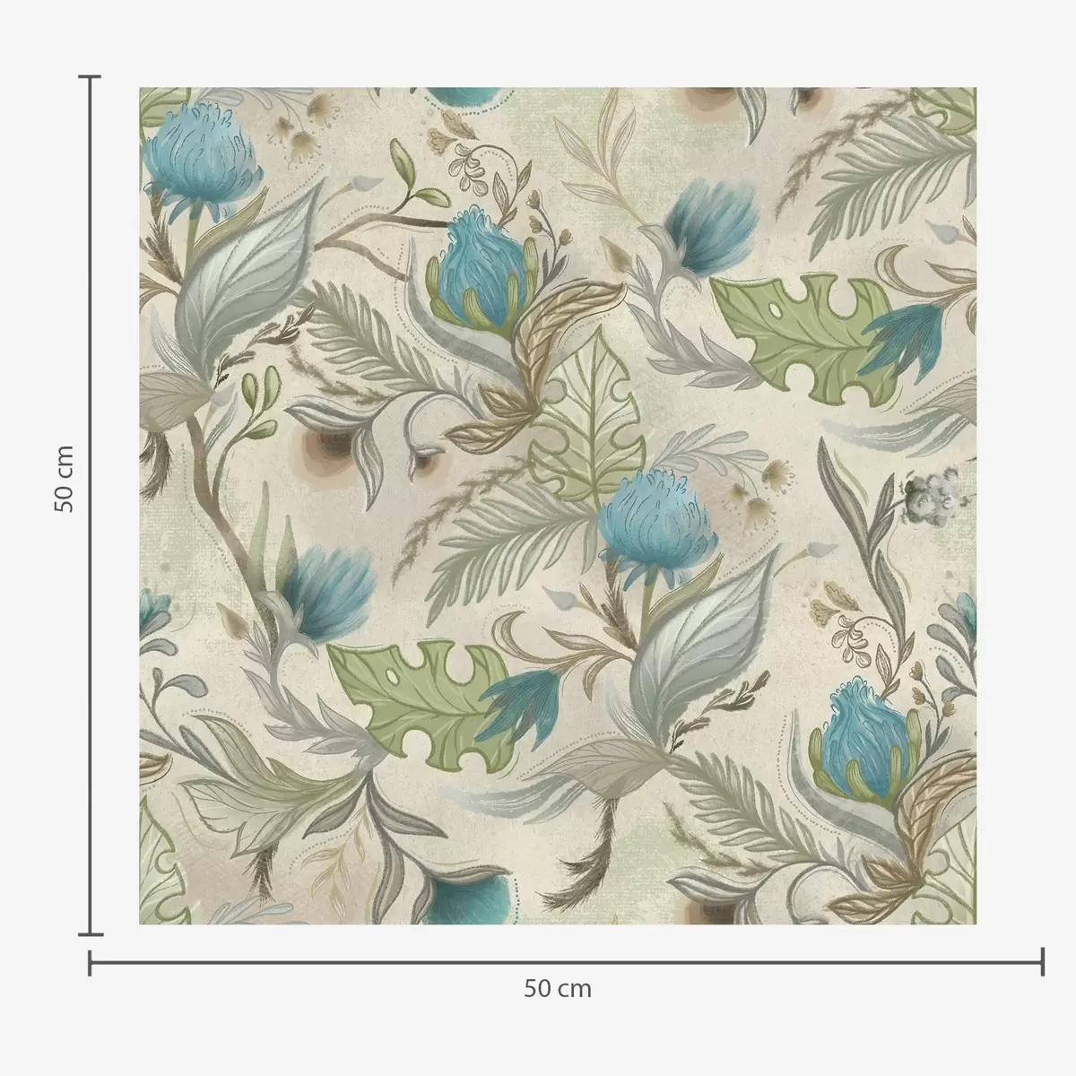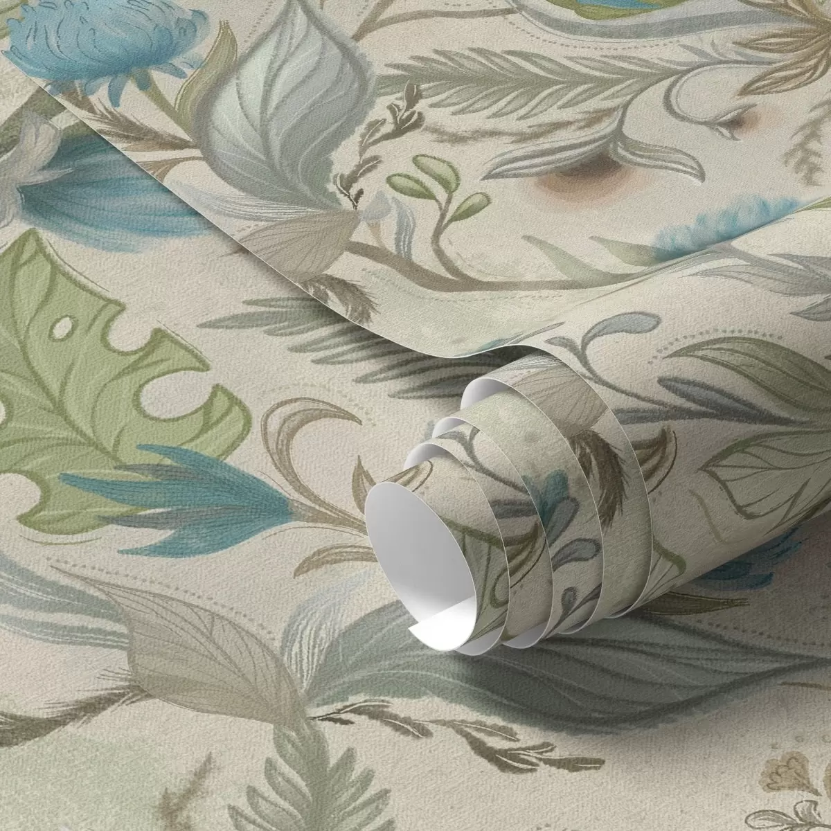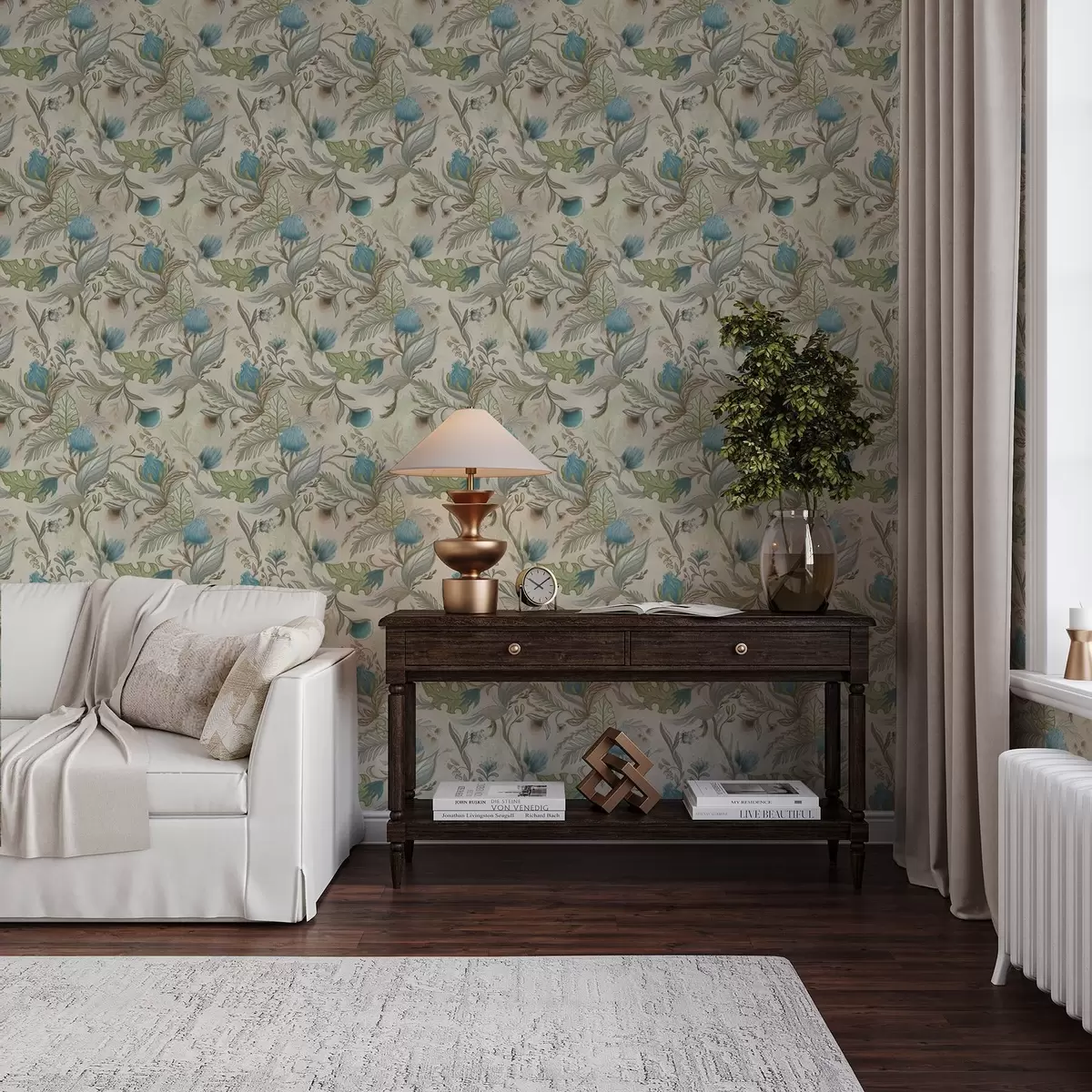 Papel pintado Capullos y hojas azules sobre un fondo beige claro. Nr. a00930