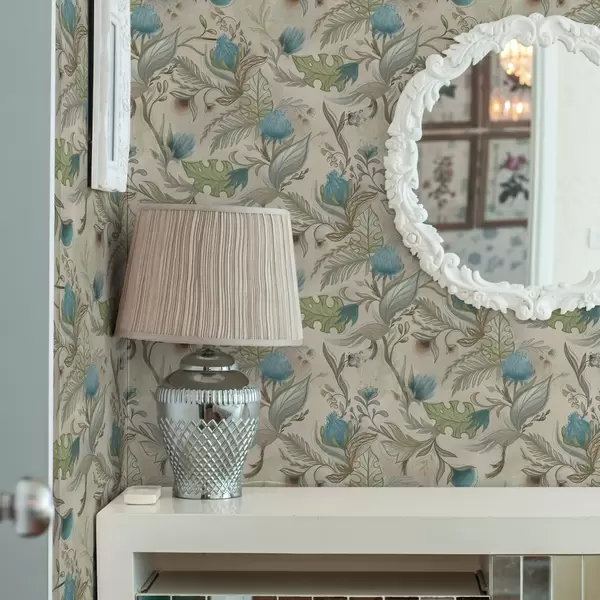 Papel pintado Capullos y hojas azules sobre un fondo beige claro. Nr. a00930