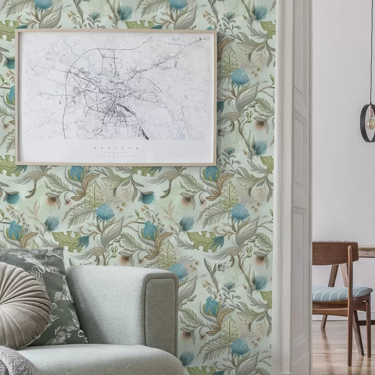 Papel pintado Flores azules y vegetación sobre un suave fondo menta. Nr. a00930v1
