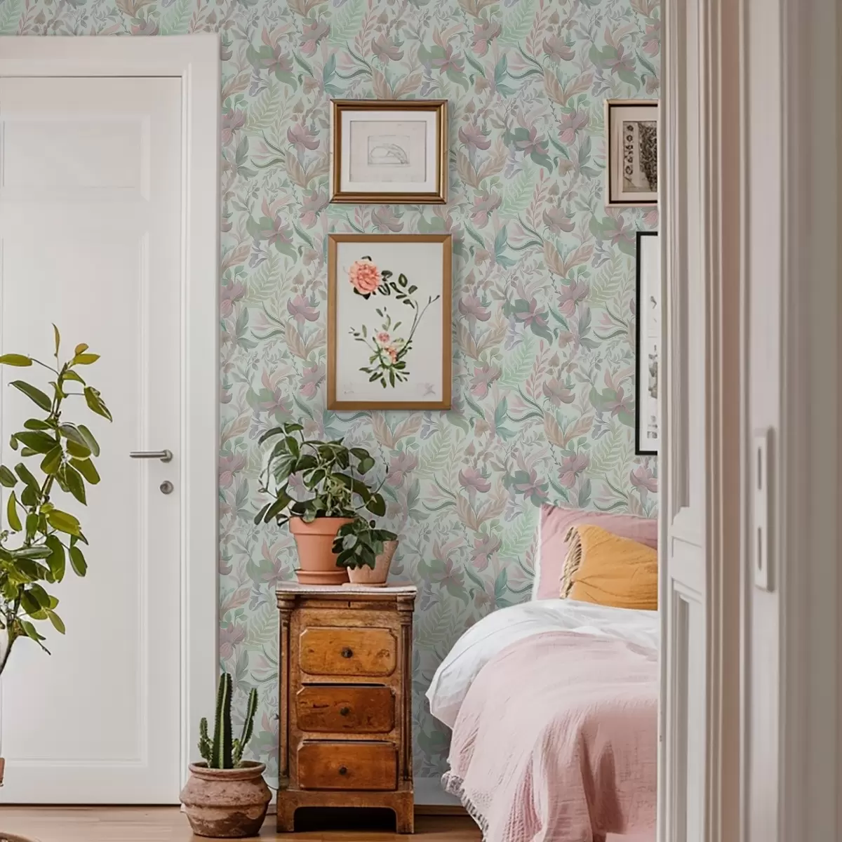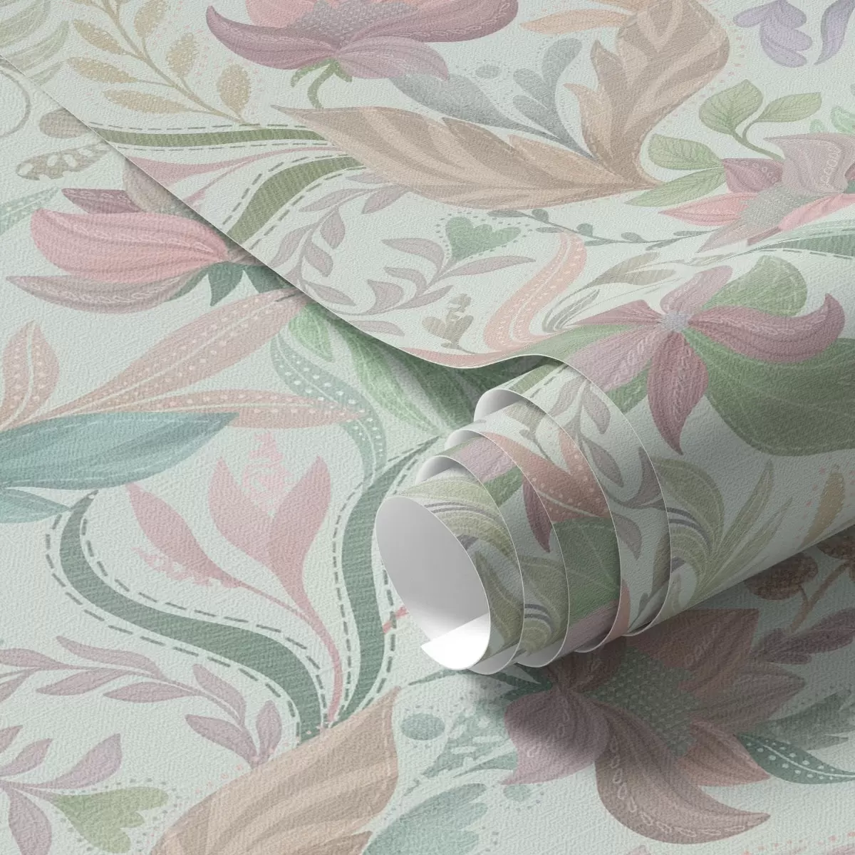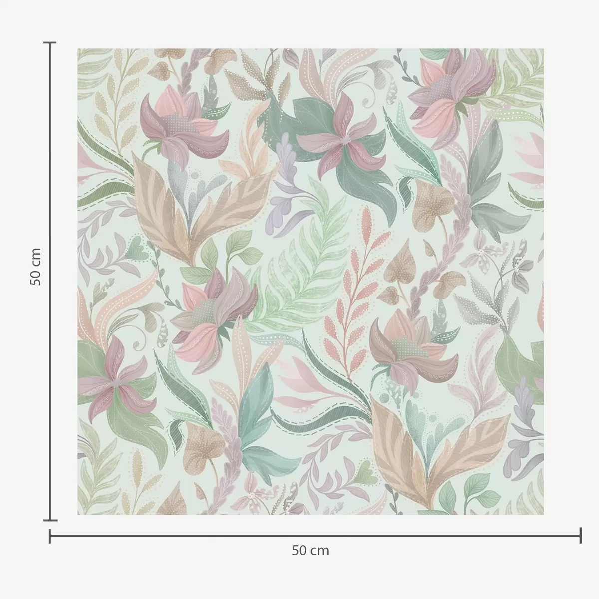 Papel pintado Estampados florales en tonos pastel sobre un suave fondo menta. Nr. a00931v1