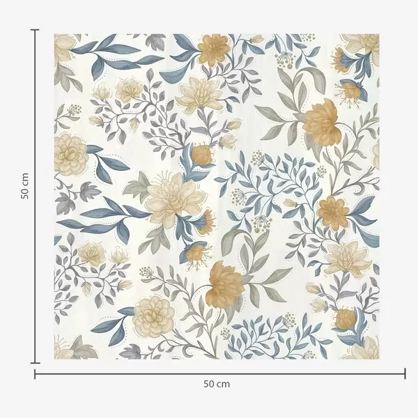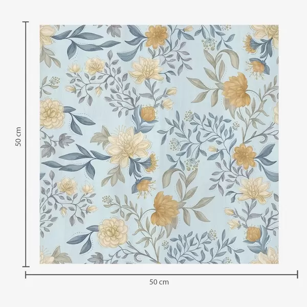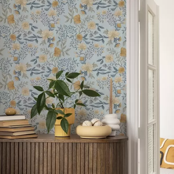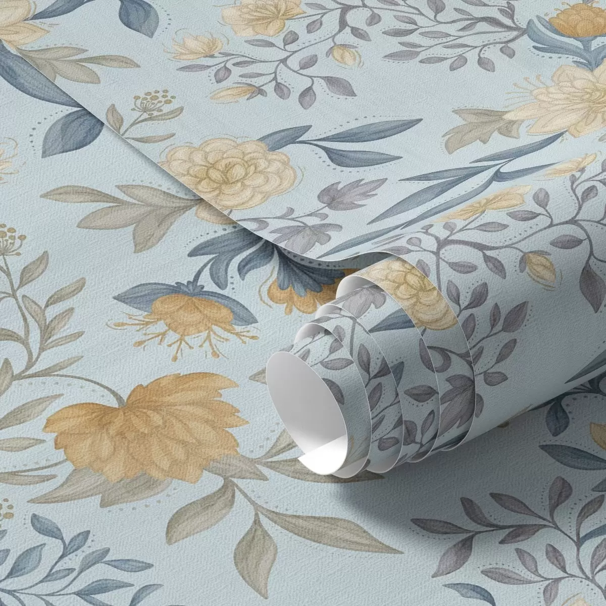 Papel pintado Flores amarillas y azules con hojas sobre un fondo azul cielo. Nr. a00934