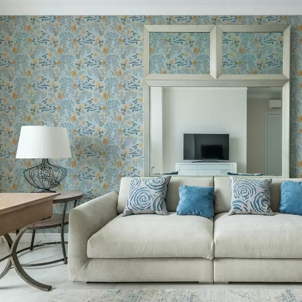 Papel pintado Flores amarillas y azules con hojas sobre un fondo azul cielo. Nr. a00934