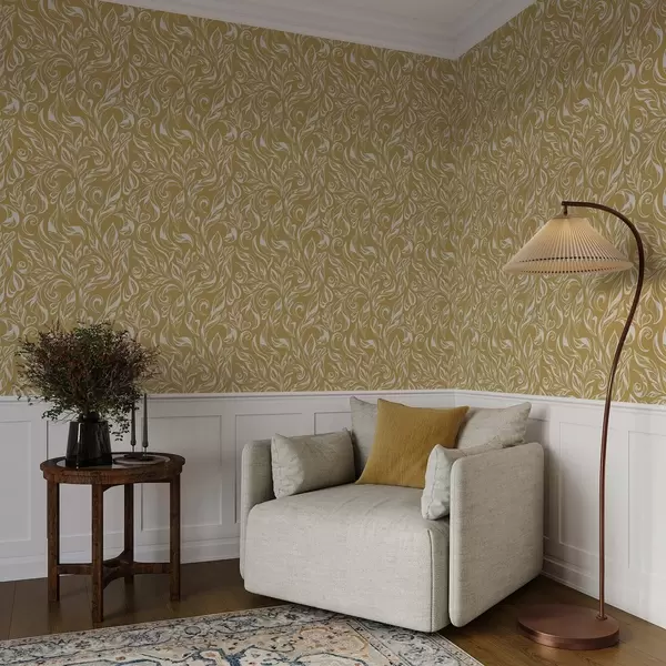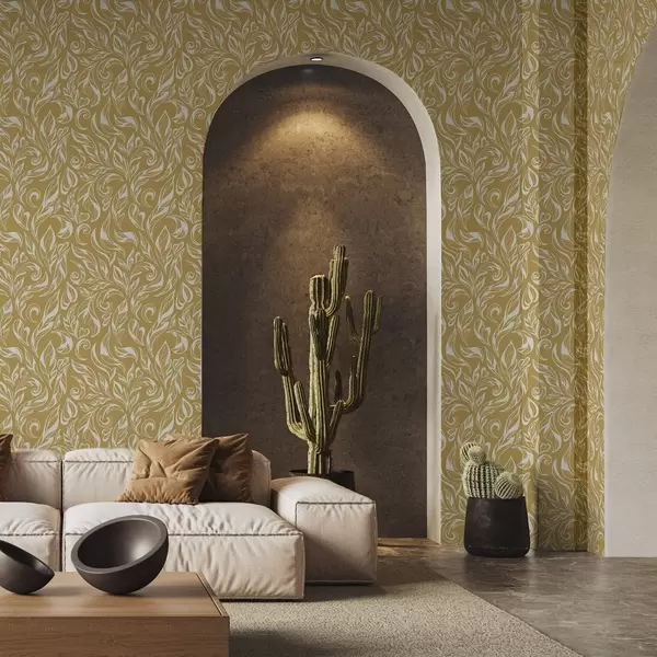 Papel pintado Adorno foliado de color blanco crema sobre un fondo ocre cálido Nr. a00940v1