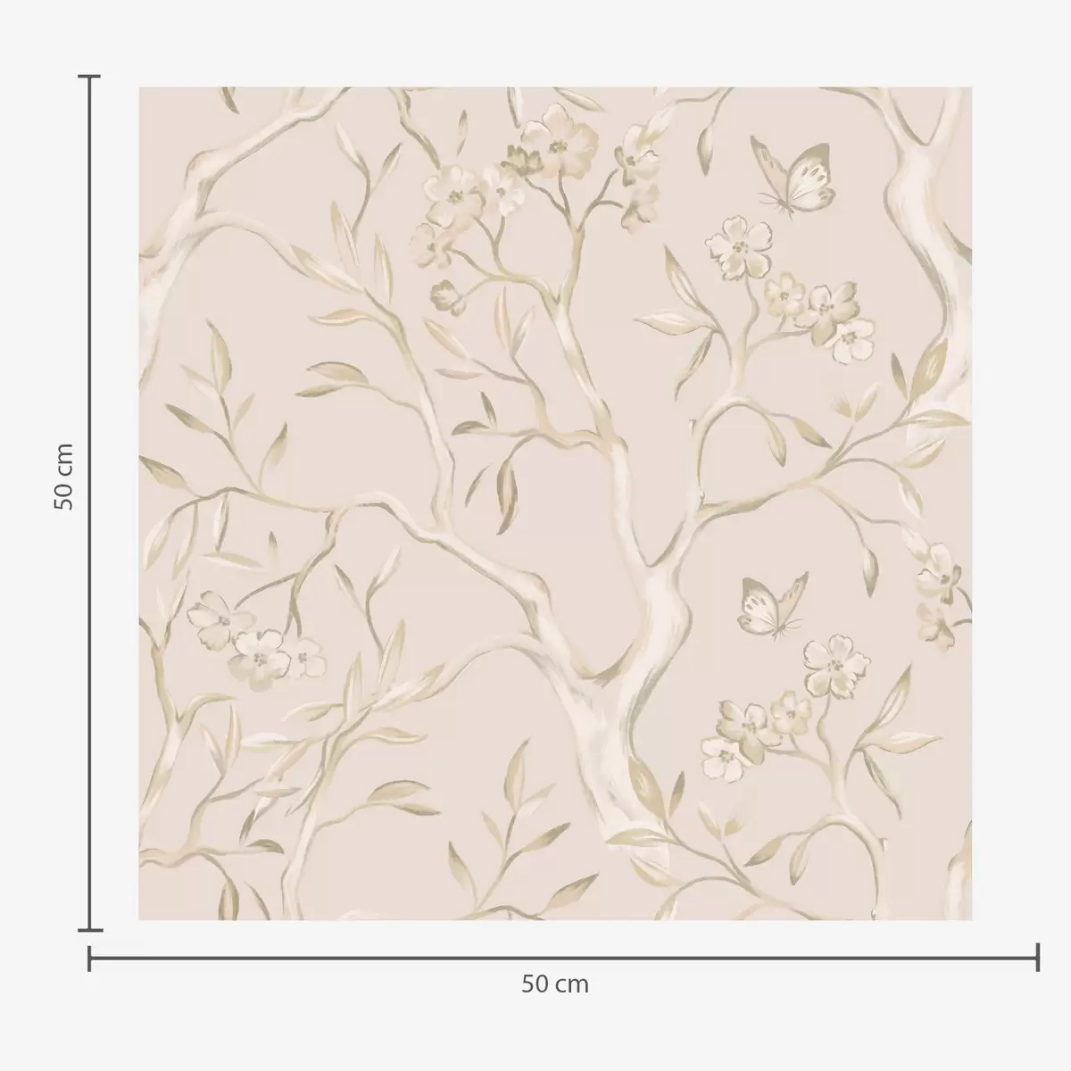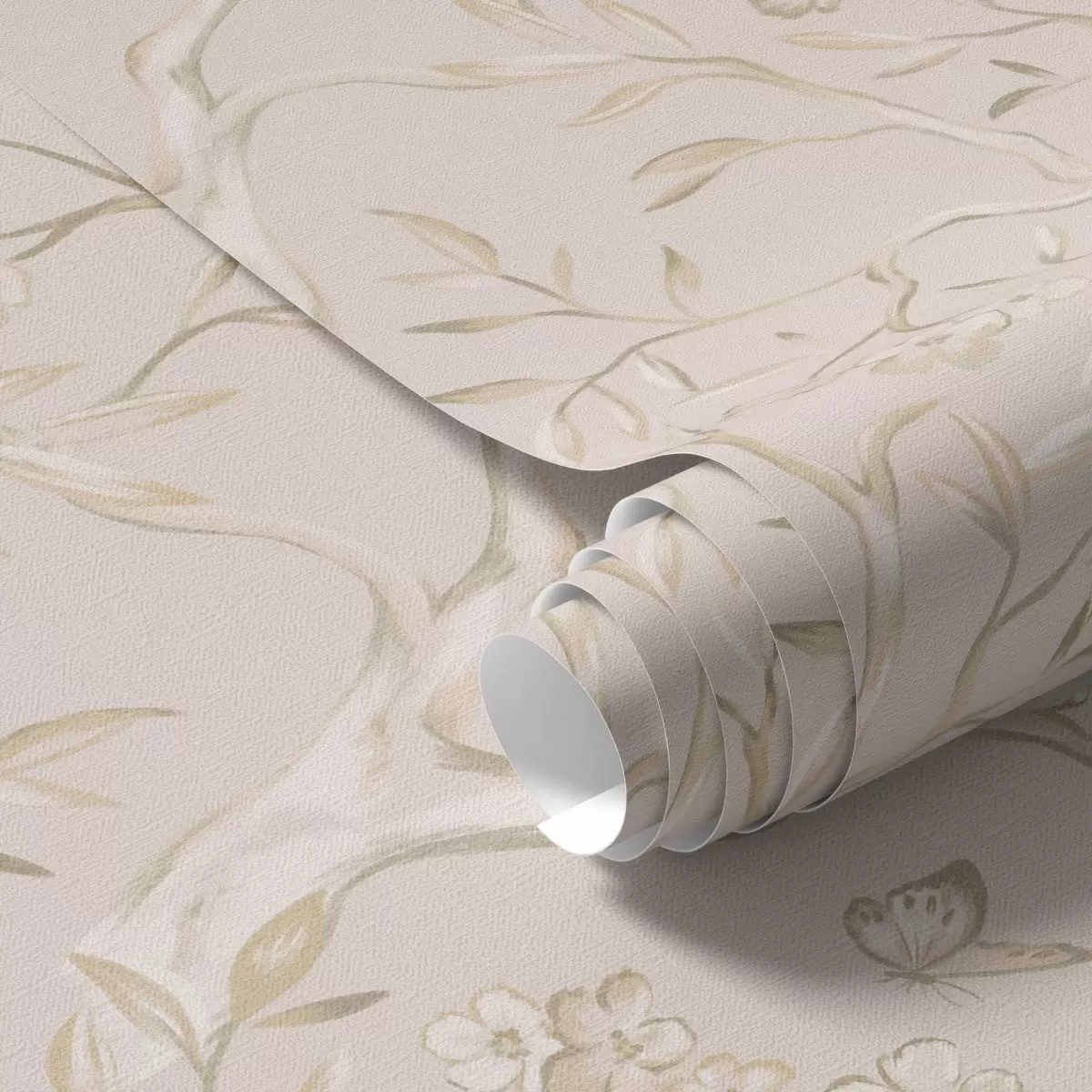 Papel pintado Ramas con flores de color beige y mariposas sobre un fondo suave. Nr. a00951v2