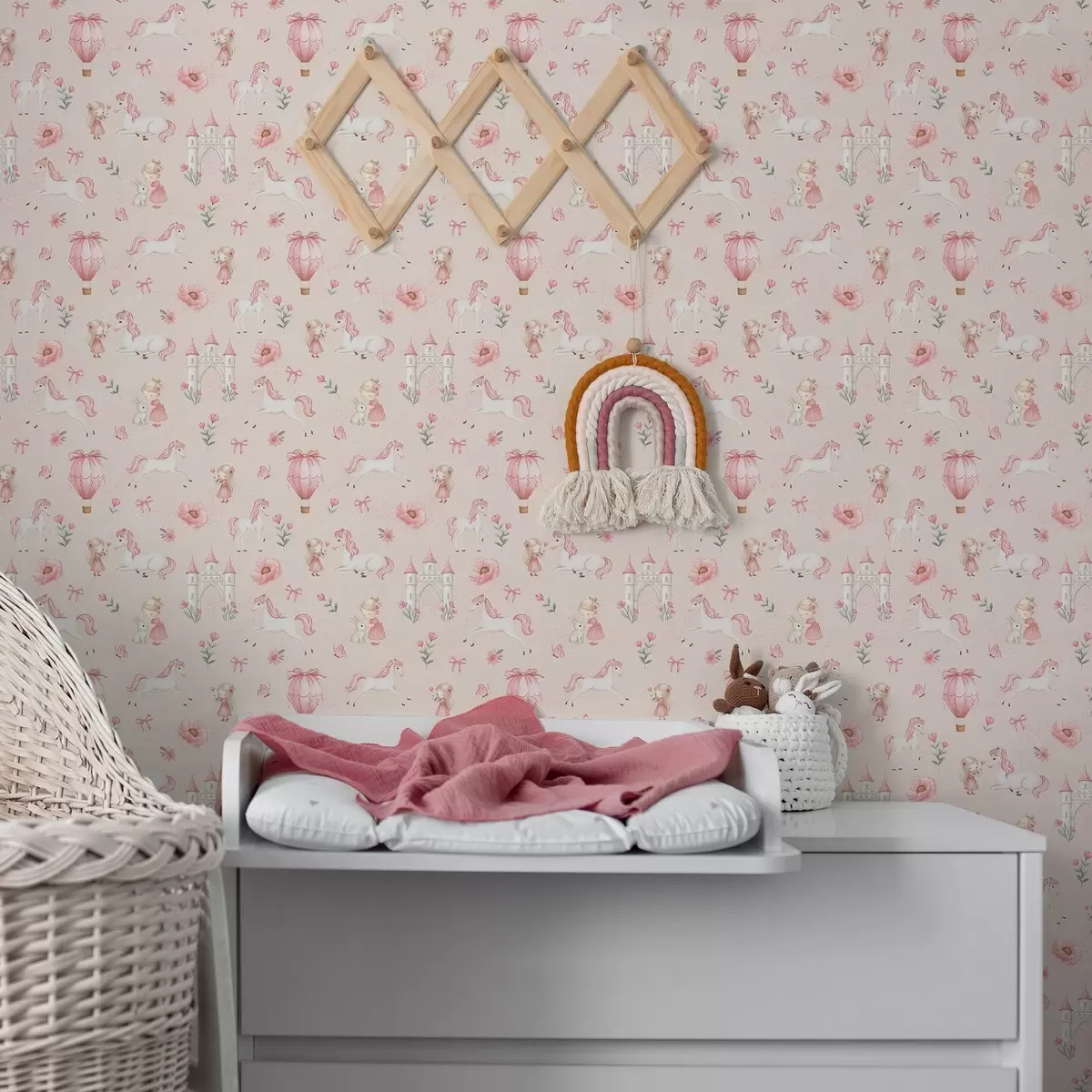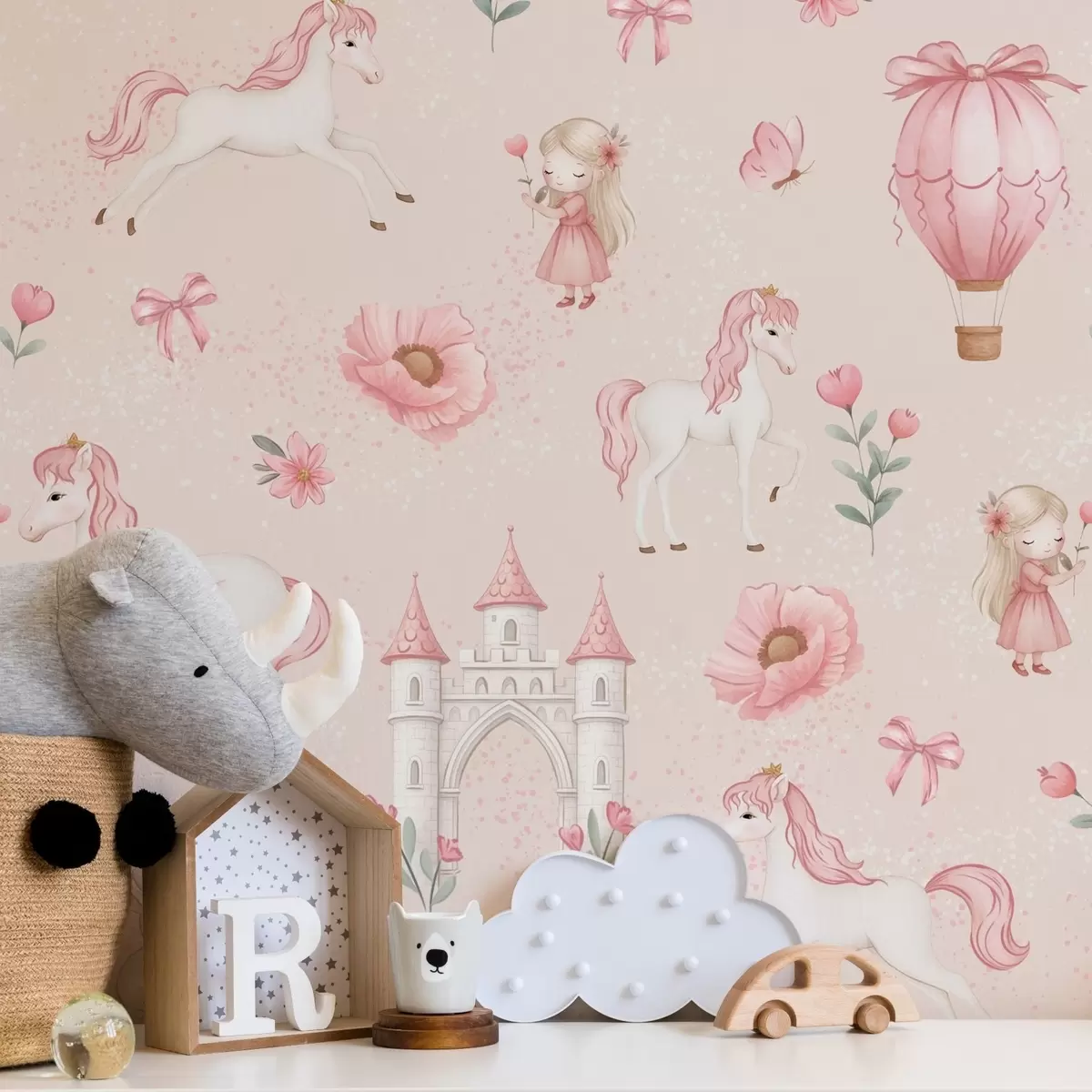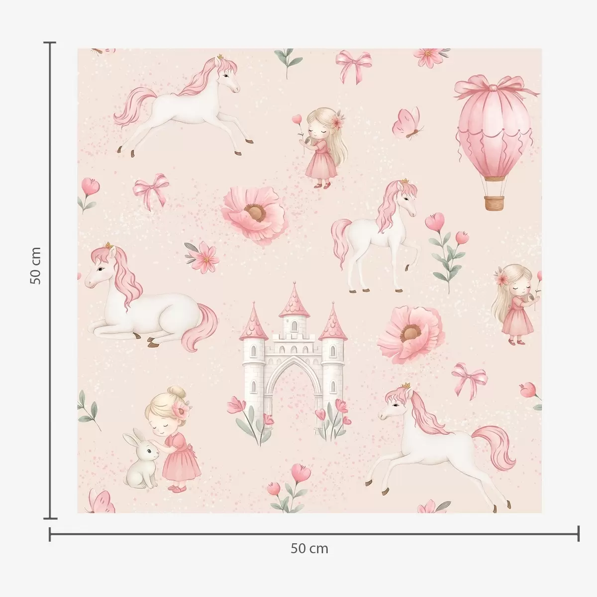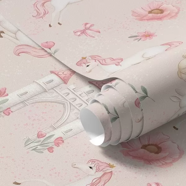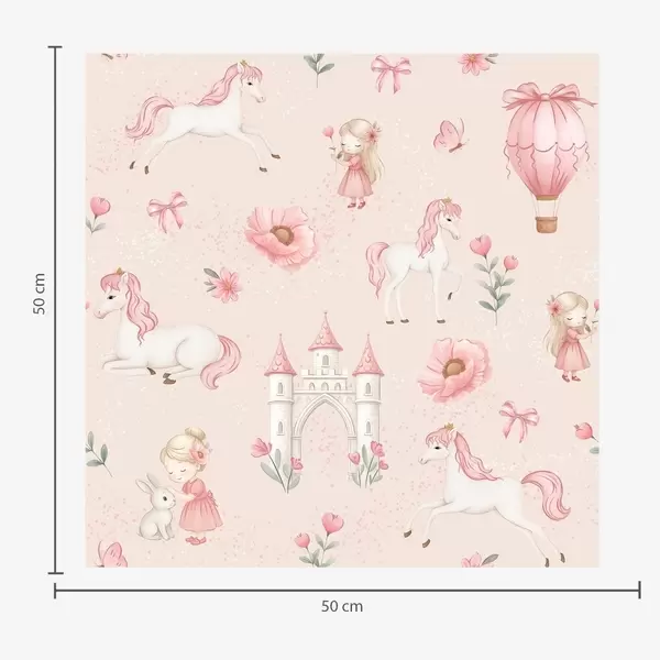 Papel pintado Unicornios rosas, niñas pequeñas y un castillo sobre un fondo suave. Nr. a00957