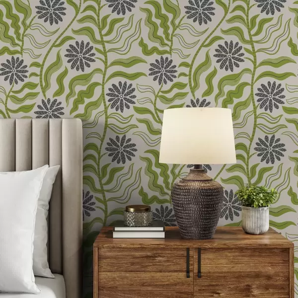 Papel pintado Divertidas margaritas verdes con hojas onduladas sobre fondo crema Nr. a00998