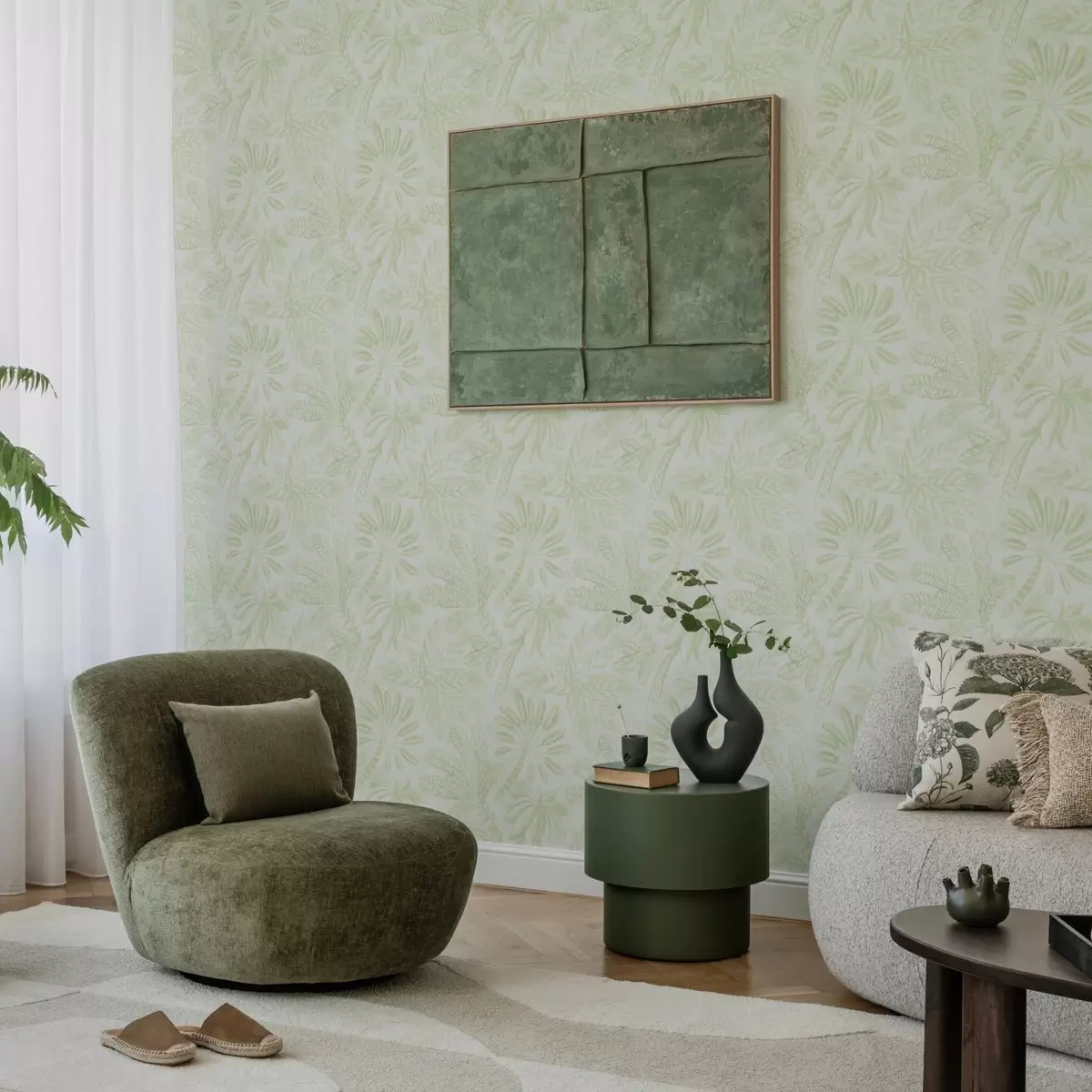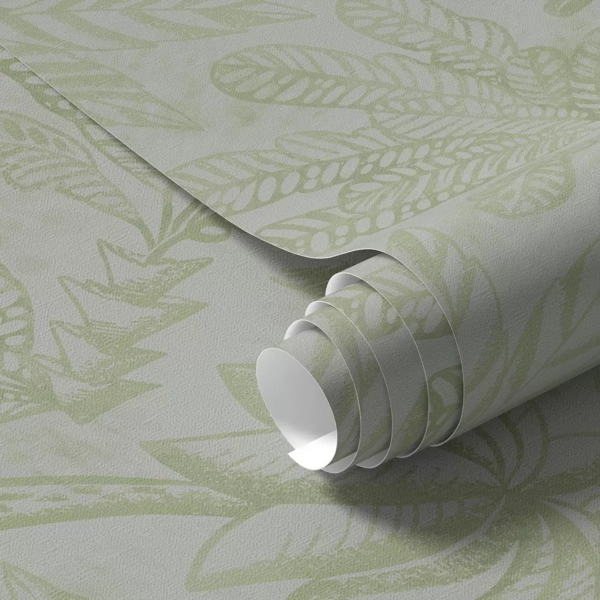 Papel pintado Hojas tropicales esbozadas en tonos verde claro frescos. Nr. a01001v1