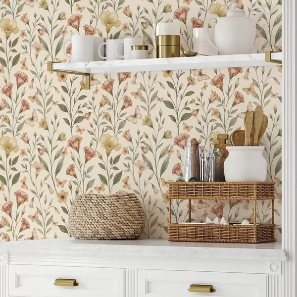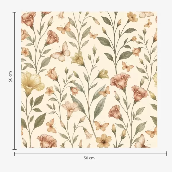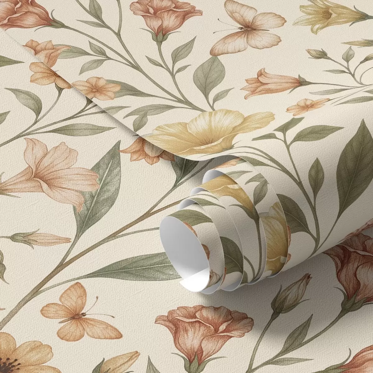 Papel pintado Delicadas flores de melocotonero y mariposas sobre un cálido fondo color crema. Nr. a01026