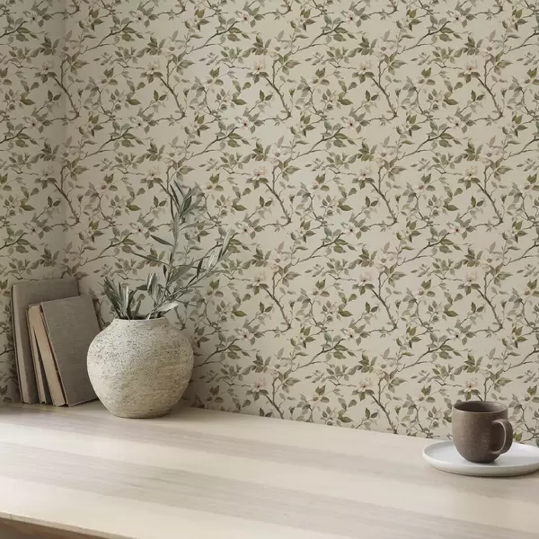 Papel pintado Ramas ligeras con pequeñas flores color crema y hojas verdes Nr. a01028