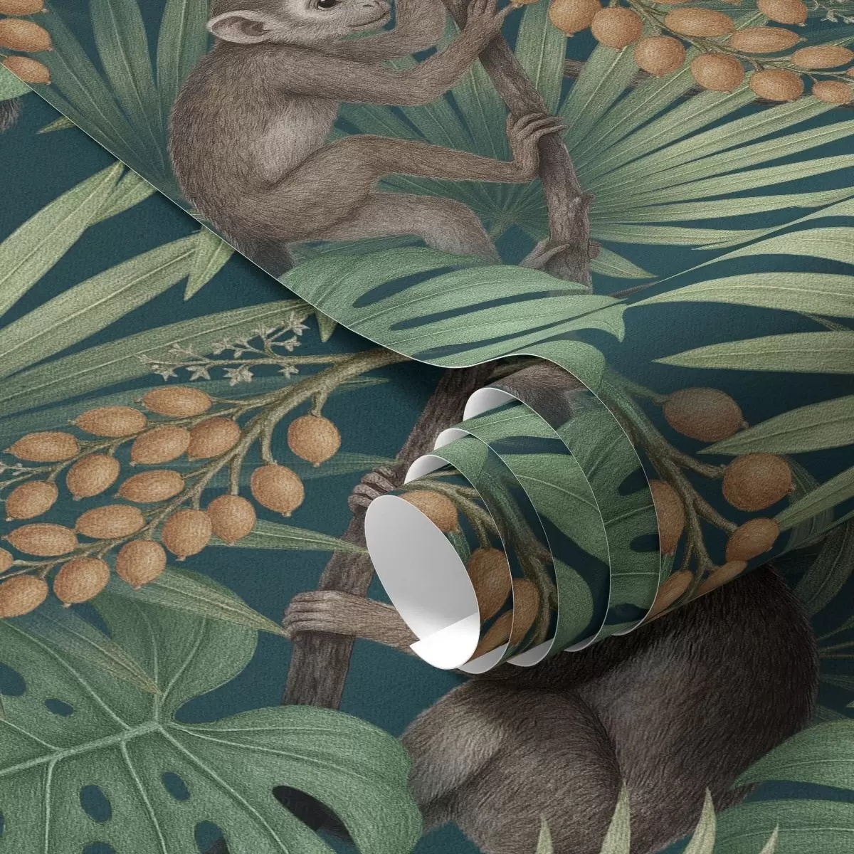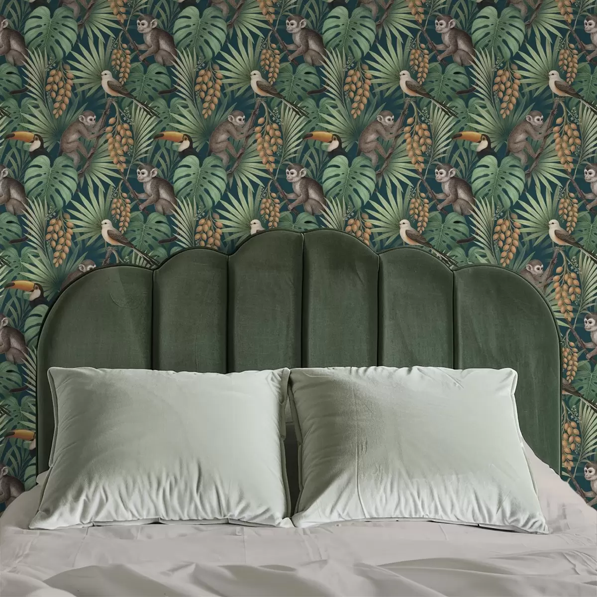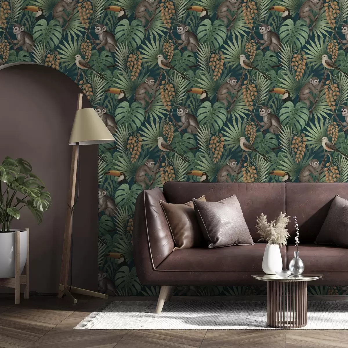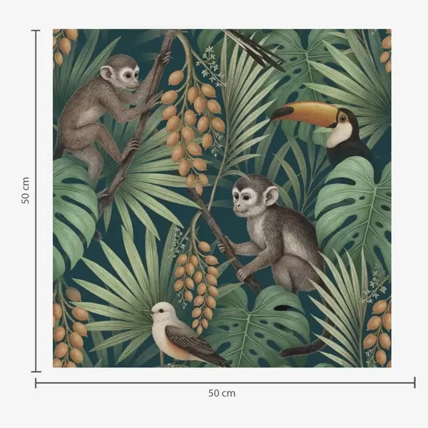 Papel pintado Monos y aves tropicales en la densa vegetación de la selva. Nr. a01037
