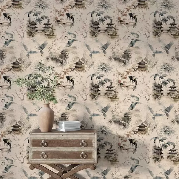 Papel pintado Templos japoneses, peces koi y grullas sobre un fondo suave. Nr. a01040