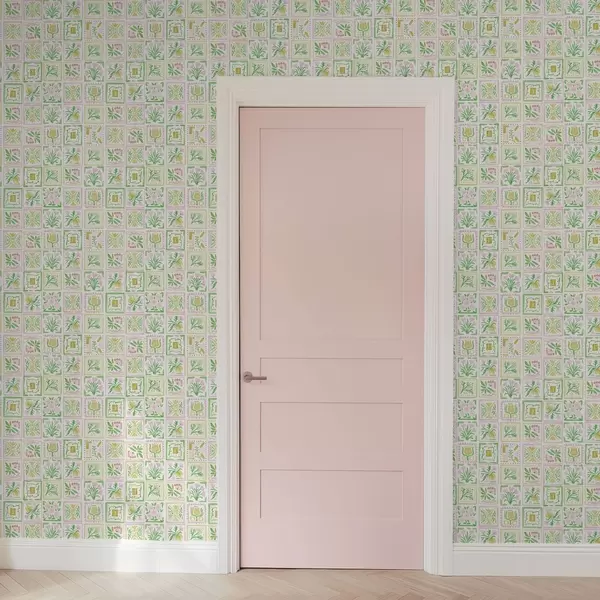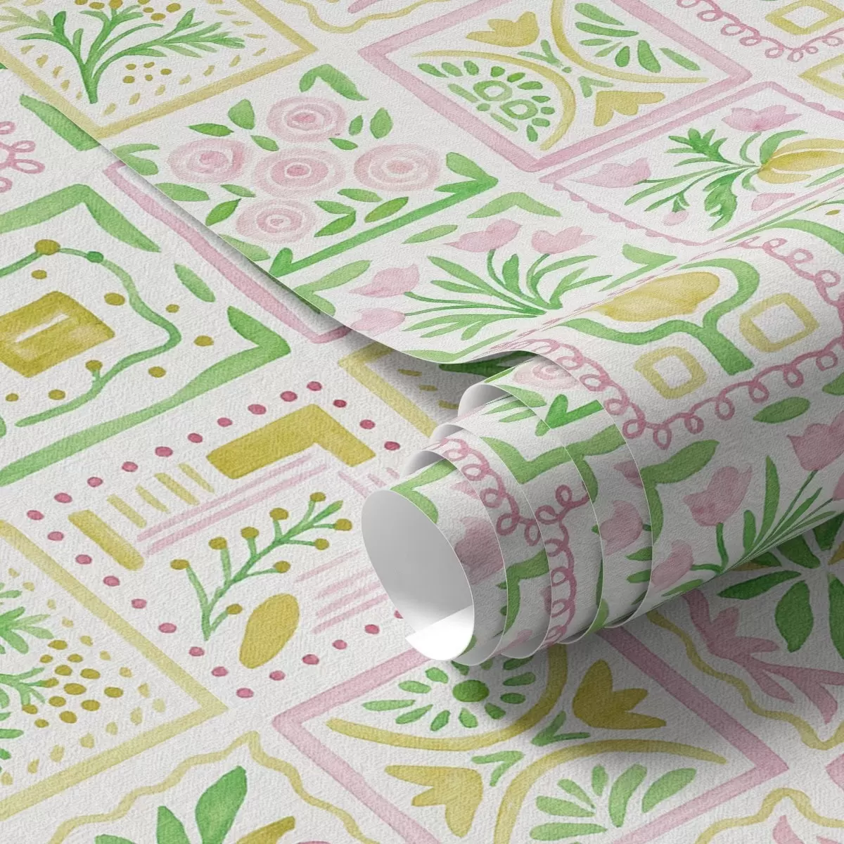 Papel pintado Cuadrados acuarelados con ramas rosas y verdes Nr. a01082
