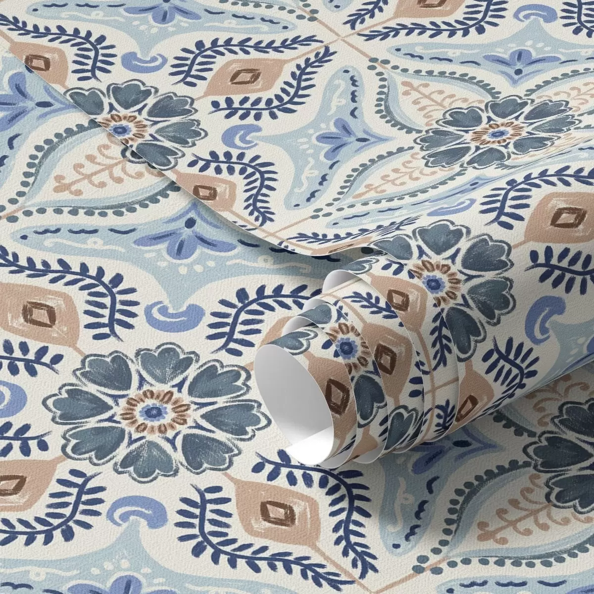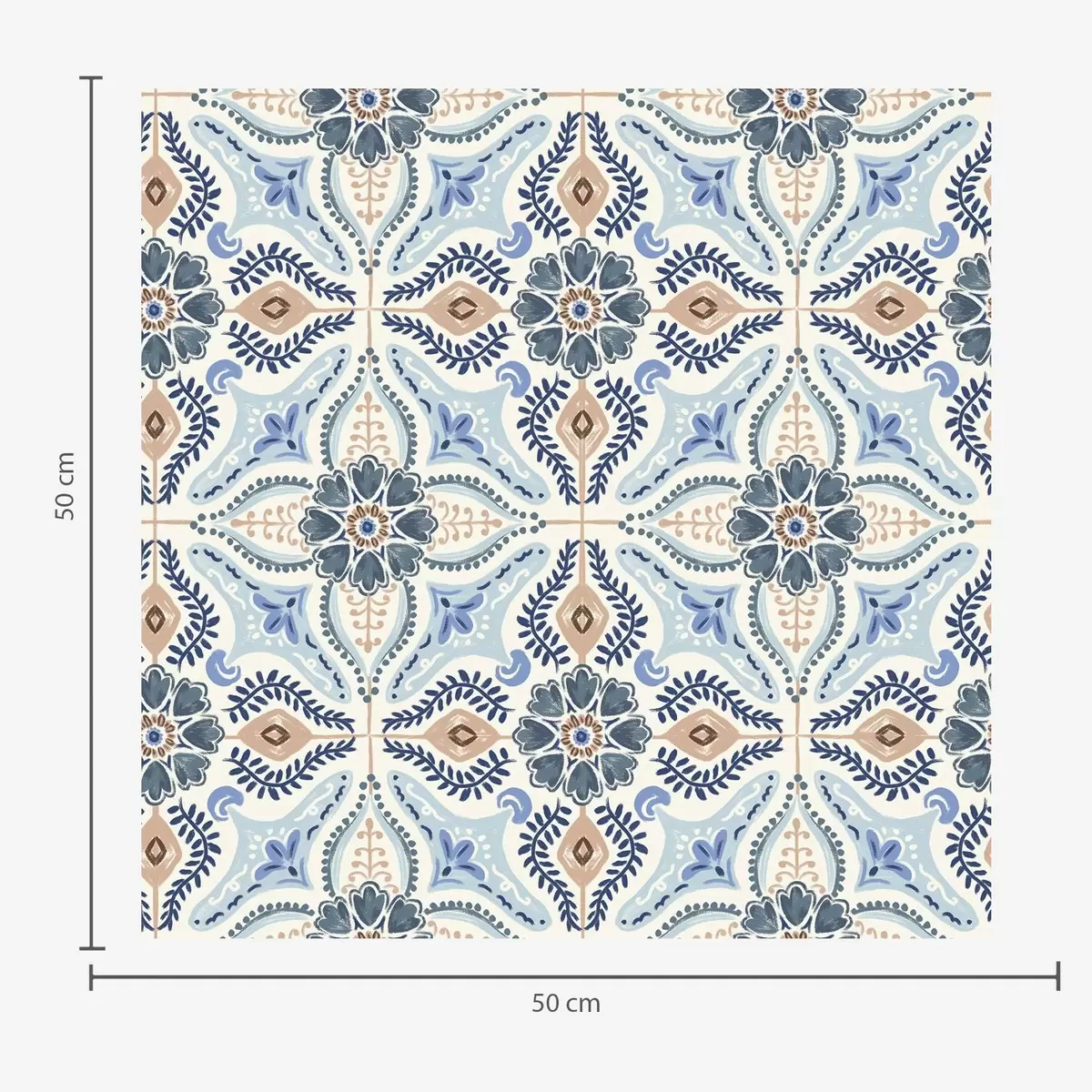 Papel pintado Adorno estilo azulejo azul-beige pintado en acuarela Nr. a01085