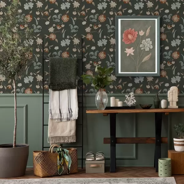 Papel pintado Fondo verde oscuro con flores y hojas decorativas Nr. a01086